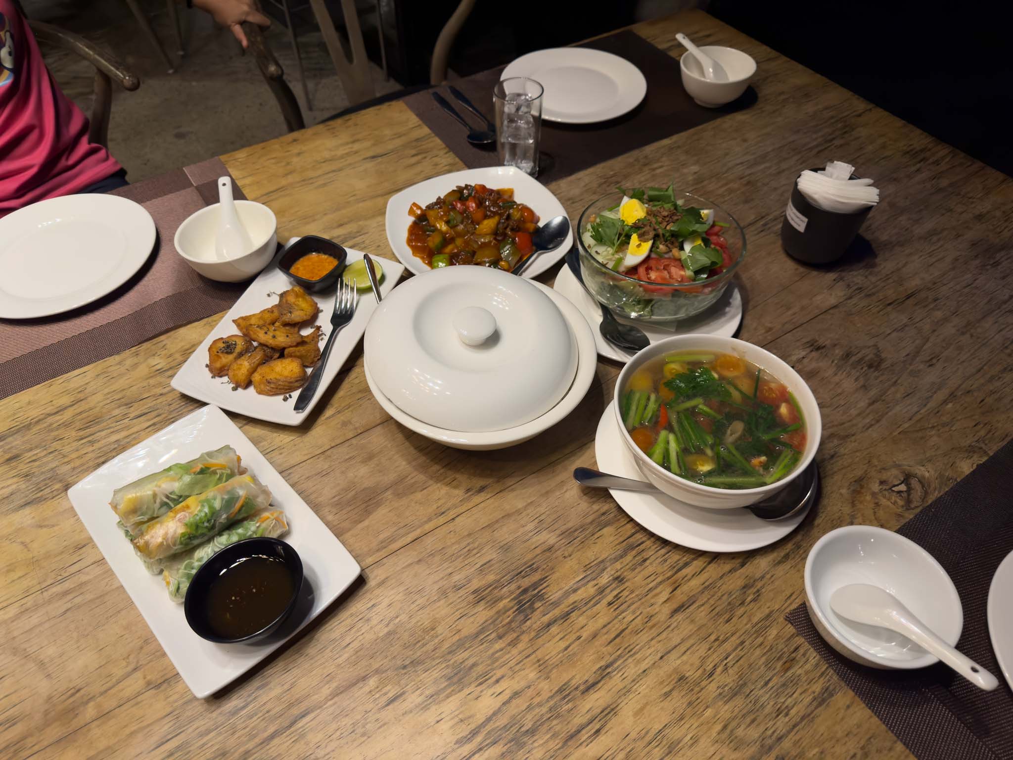ข้าวเย็นรอบนี้จะมาพร้อมแพ็คเกจของที่พัก เลยดูกระจ้อยร่อยเหมาะแก่คนทานน้อย สต๊าฟเลยสั่งไข่เจียวมาเพิ่ม สรุปอิ่ม ๆ มีผลไม้ตบท้าย นั่งคุยจิบชาร้อนกันไป อากาศเริ่มมีลมเย็น แต่ก็มียุง แนะนำฉีดยากันยุงดีกว่า นั่งคุยไปมาจำได้ว่าช่วงนี้มีทางช้างเผือก แต่แสงไฟของรีสอร์ทรบกวน พร้อมกับความมือใหม่ เพิ่งเคยถ่ายช้างแรกด้วยมือถือก็เลยได้มาแค่นี้ล่ะ
