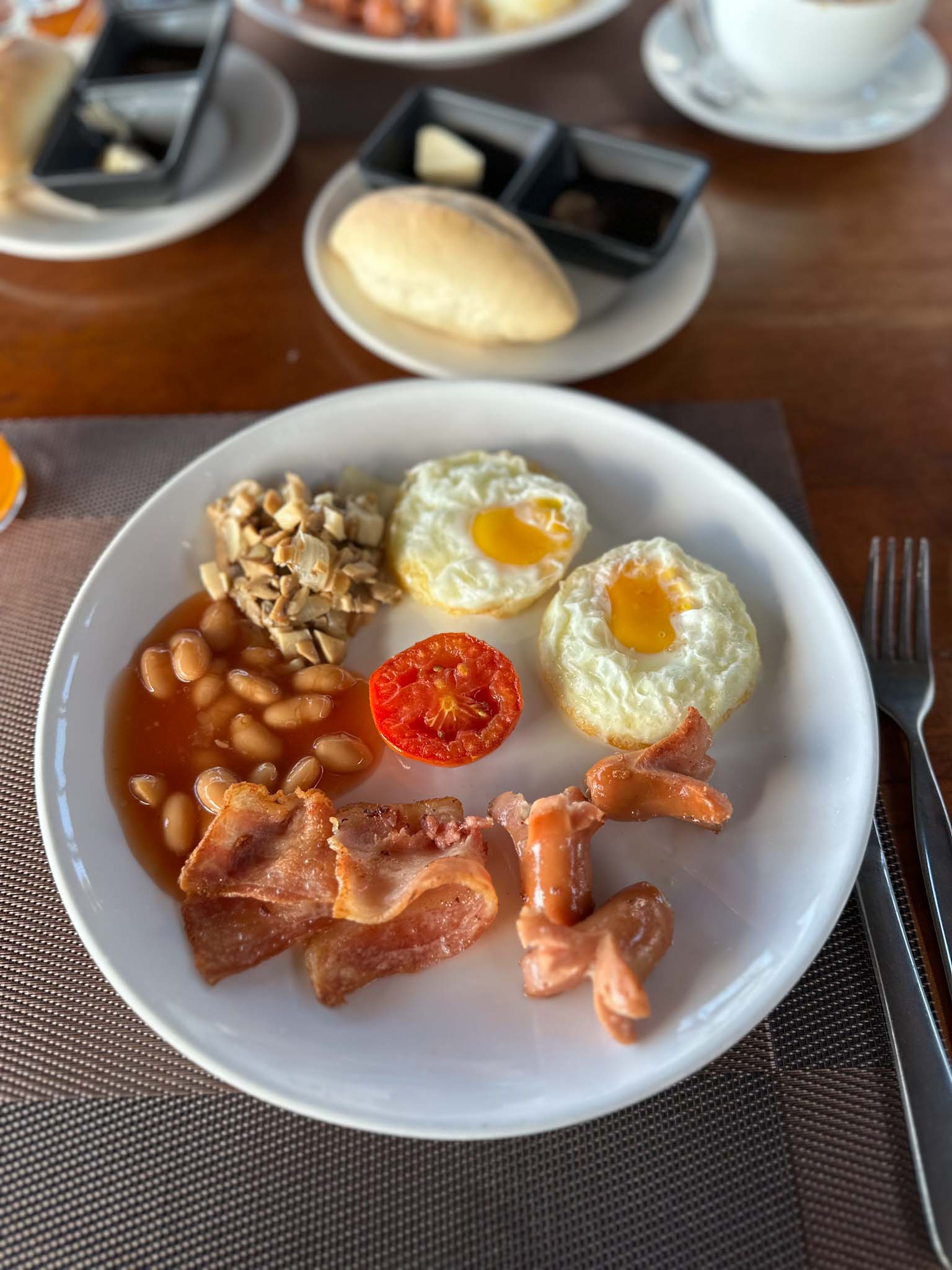 ตื่นมา7:00 และทานมื้อเช้าของที่พัก มีให้เลือกแบบ English Breakfast ไข่ 2 ไส้กรอก baked bean เบค่อน เห็ดผักกับหัวหอม และแป้งจี่ที่ไม่ใช่ข้าวเหนียวชุบไข่ปิ้ง แต่เป็นขนมปังคล้ายๆ  ปาแก้ต มาพร้อมเนยสด และแยมมะขาม เออ แปลกดีแฮะ  อ้อชุดจะมีกาแฟด้วย มีเมนูอย่างอื่นด้วย เช่น ข้าวผัดไข่ (รสชาติดีอยู่นะ) ผัดหมี่ panini ham cheese  เสริฟพร้อมสลัดผักราดบัลซามิก เป็นต้น ทานเสร็จก็รีบกลับไปฉี่ก่อนเลยเพราะเดี๋ยวใส่ชุดอุปกรณ์แล้วลำบาก