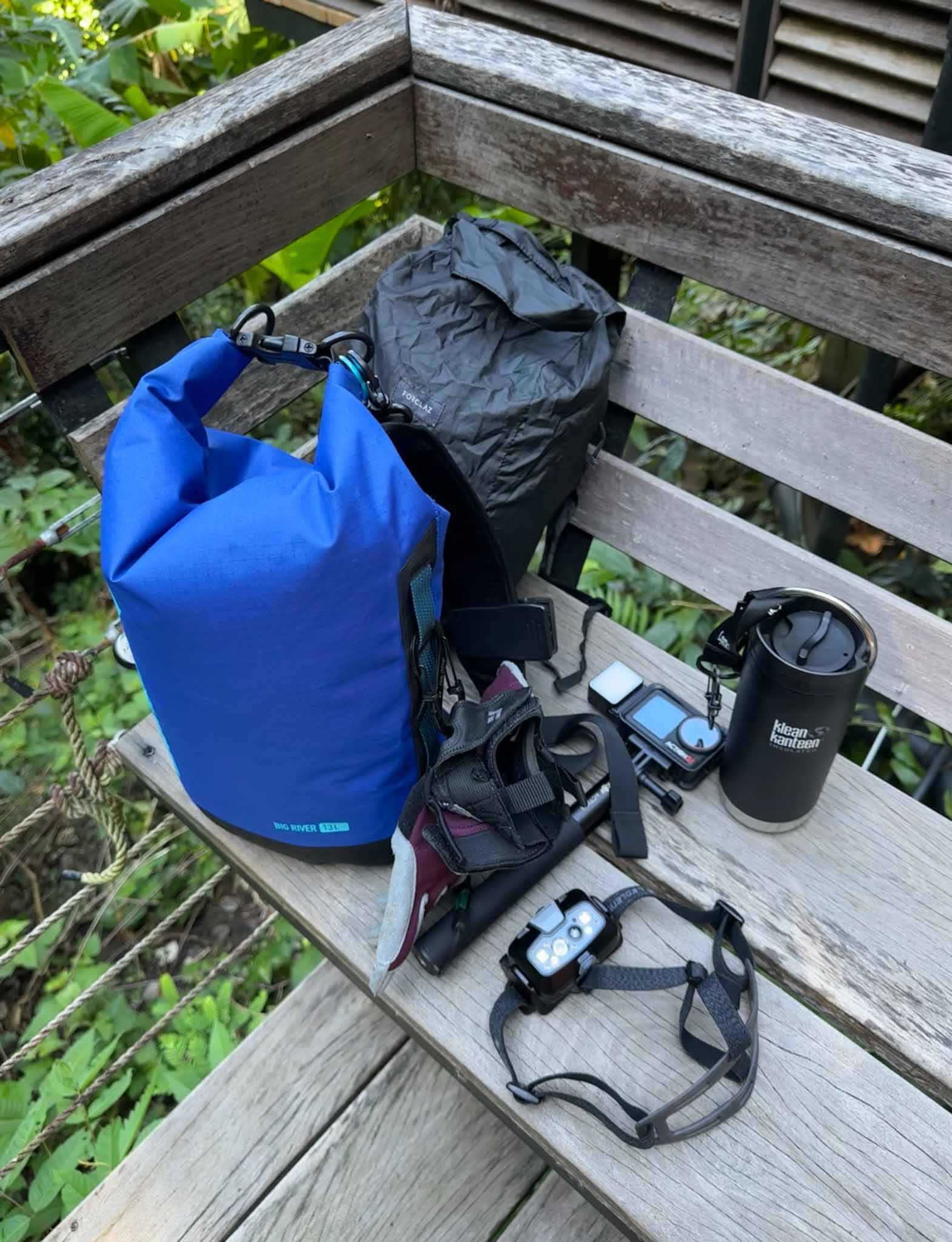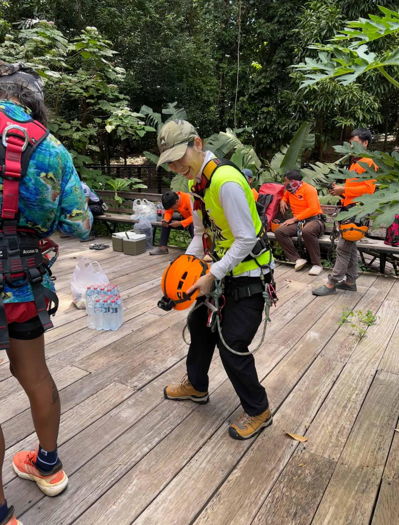 อุปกรณ์ที่ต้องติดตัวเราไปนับตั้งแต่นี้ ได้แก่ Harness, Helmet, Figure 8,  CAMP,  carabiner,  chest ascender,  ascender Handle, Fall arrester, foot loop, สายlandyard คู่, Giant, ตัวกันตก เค้าเรียกว่าอะไรนะ Fall arrester มั้งนะ หากผิดขออภัย ทั้งหมดนี่น่าจะหนักรวมกันได้ 3-4 Kg  ก็หนักอยู่