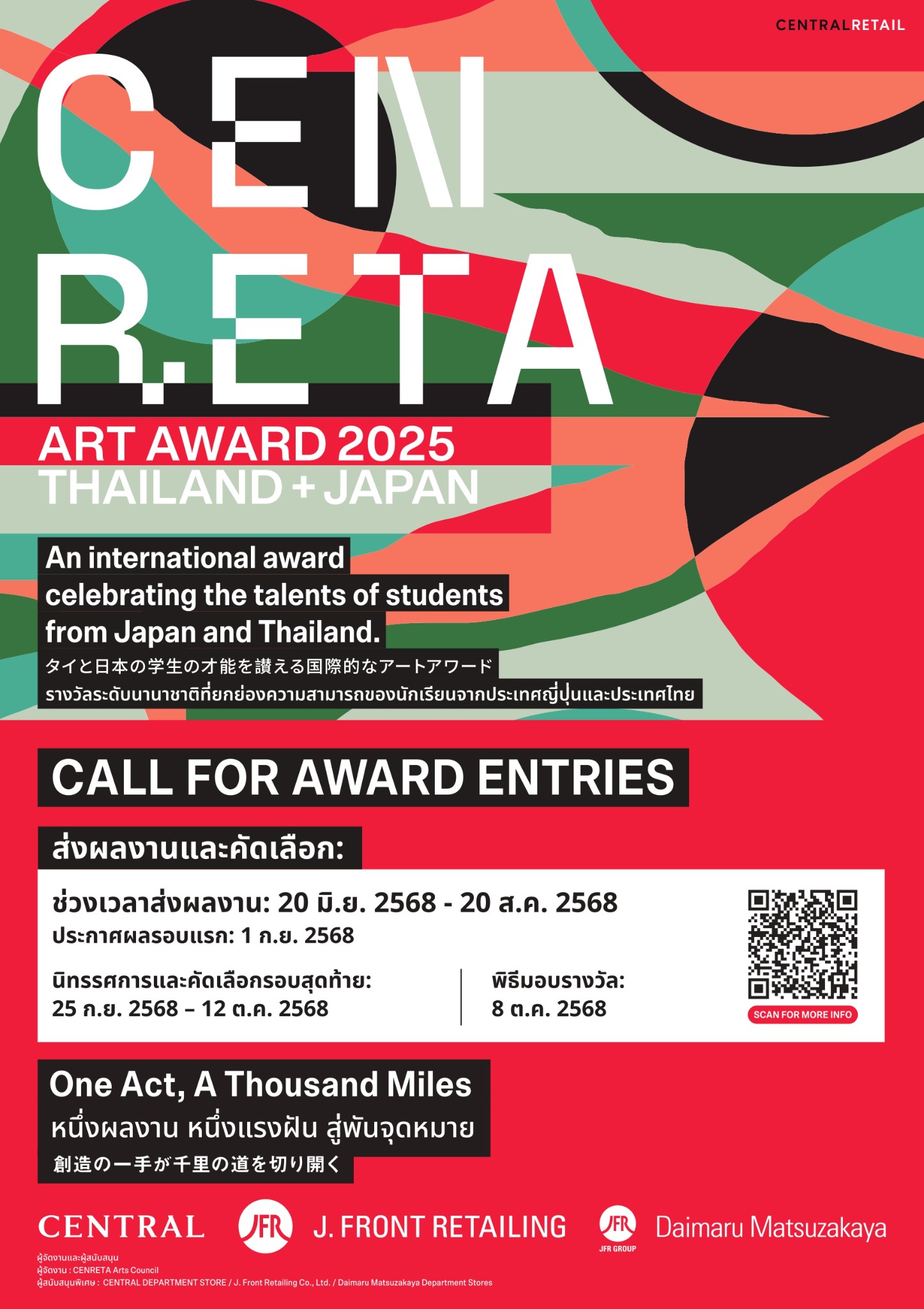 มาร่วมเป็นส่วนหนึ่งของการประกวดผลงานศิลปะระดับนานาชาติของเยาวชนไทยและญี่ปุ่นครั้งประวัติศาสตร์ “CENRETA ART AWARD 2025” ตั้งแต่วันที่ 25 ก.ย. 68 – 12 ต.ค. 68 ณ The Event Hall ห้างเซ็นทรัลชิดลม สำหรับผู้ที่สนใจสามารถติดตามรายละเอียดการประกวดเพิ่มเติมได้ที่ www.cenreta.com และ Facebook / Instagram : Central Chidlom, Central Department Store