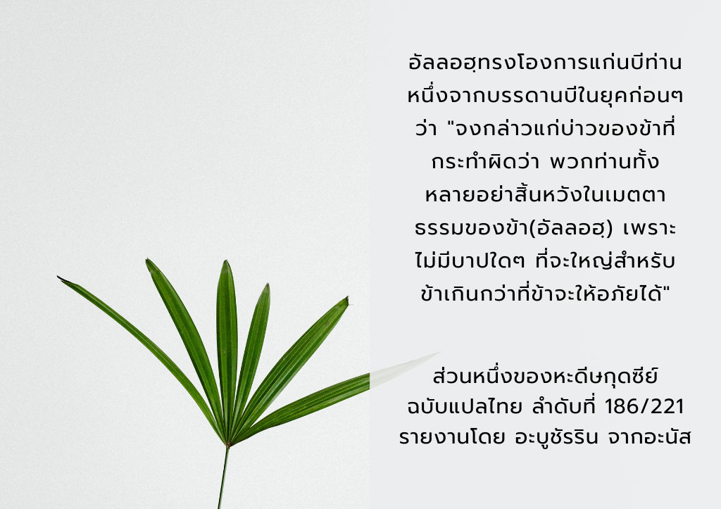 – อัลลอฮฺทรงโองการแก่นบีท่านหนึ่งจากบรรดานบีในยุคก่อนๆ ว่า “จงกล่าวแก่บ่าวของข้าที่กระทำผิดว่า พวกท่านทั้งหลายอย่าสิ้นหวังในเมตตาธรรมของข้า(อัลลอฮฺ) เพราะไม่มีบาปใดๆ ที่จะใหญ่สำหรับข้าเกินกว่าที่ข้าจะให้อภัยได้” (ส่วนหนึ่งของหะดีษกุดซีย์ ฉบับแปลไทย ลำดับที่ 186/221 รายงานโดย อะบูชัรริน จากอะนัส)