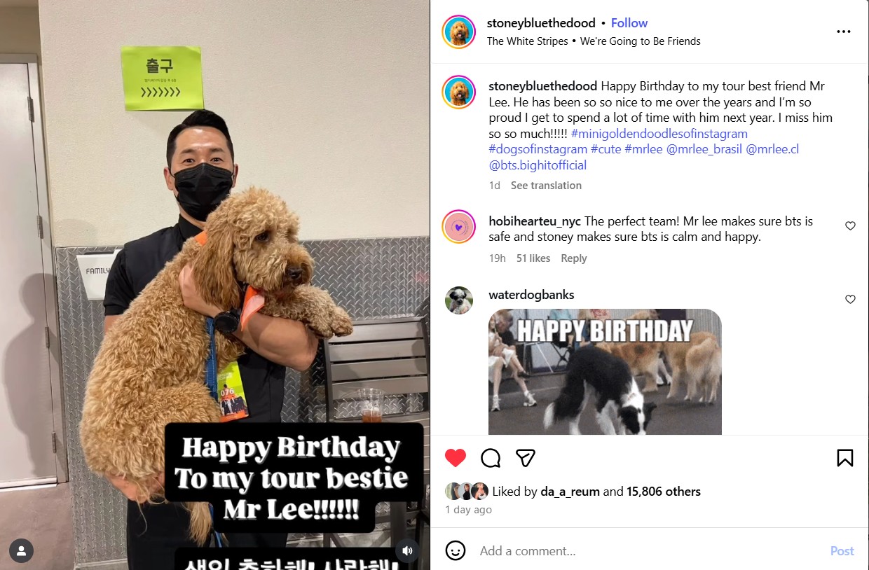 เมื่อวาน น้อง 'Stoney' สุนัขทัวร์คอนเสิร์ต BTS (หน้าที่บำบัดและประสานงานด้านจิตวิทยาให้กับศิลปินและทีมงาน) ได้มาโพสต์อวยพรวันเกิดให้กับ Mr. Lee บอดี้การ์ดของ BTS