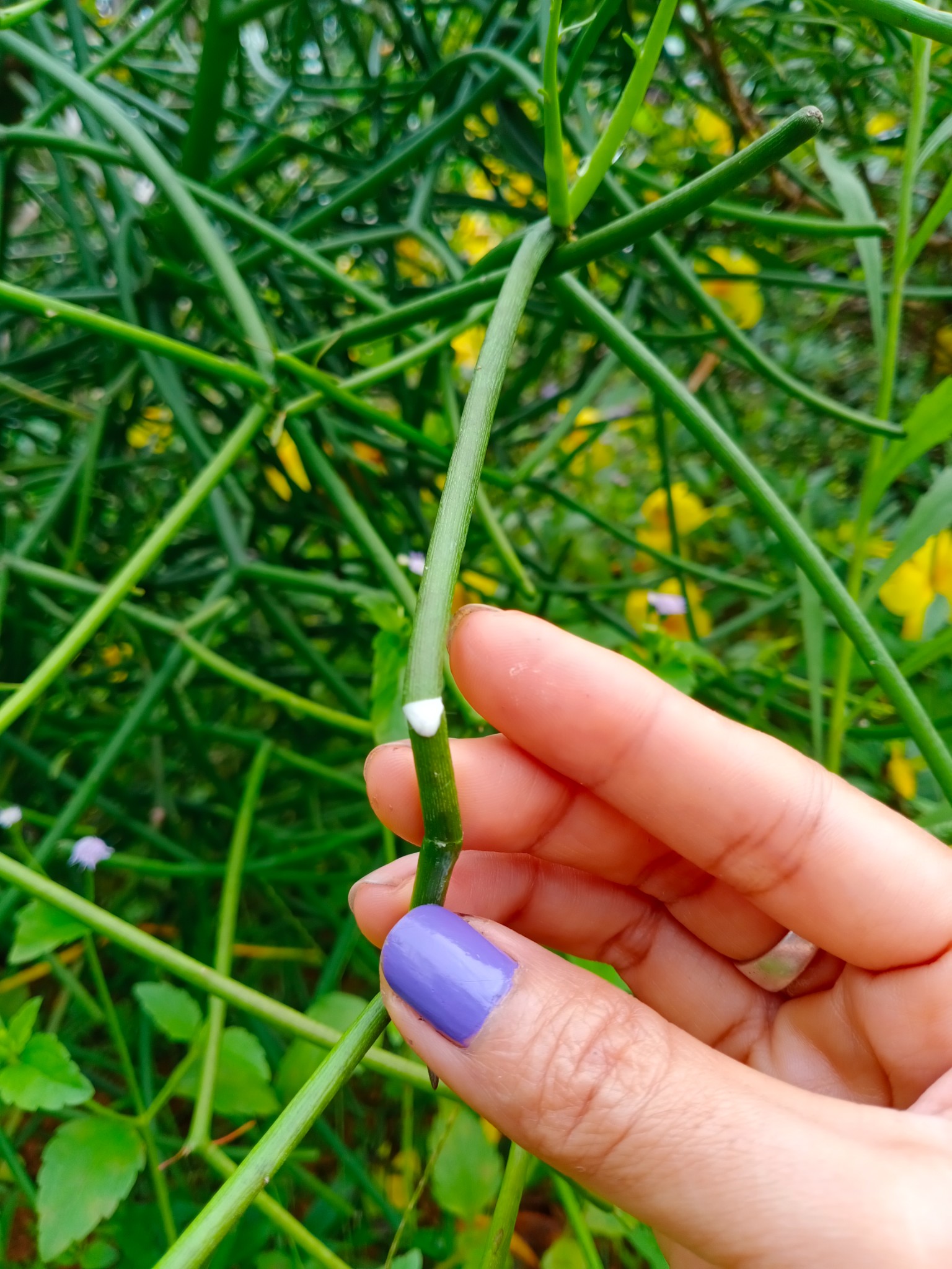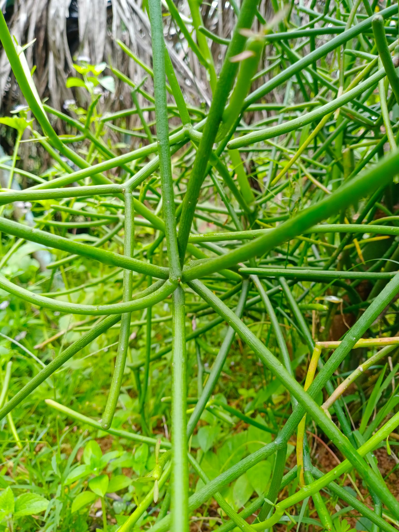 ไม้พุ่มกิ่งก้านเขียว ไม่มีใบ แต่เต็มไปด้วยน้ำยางสีขาวขุ่น