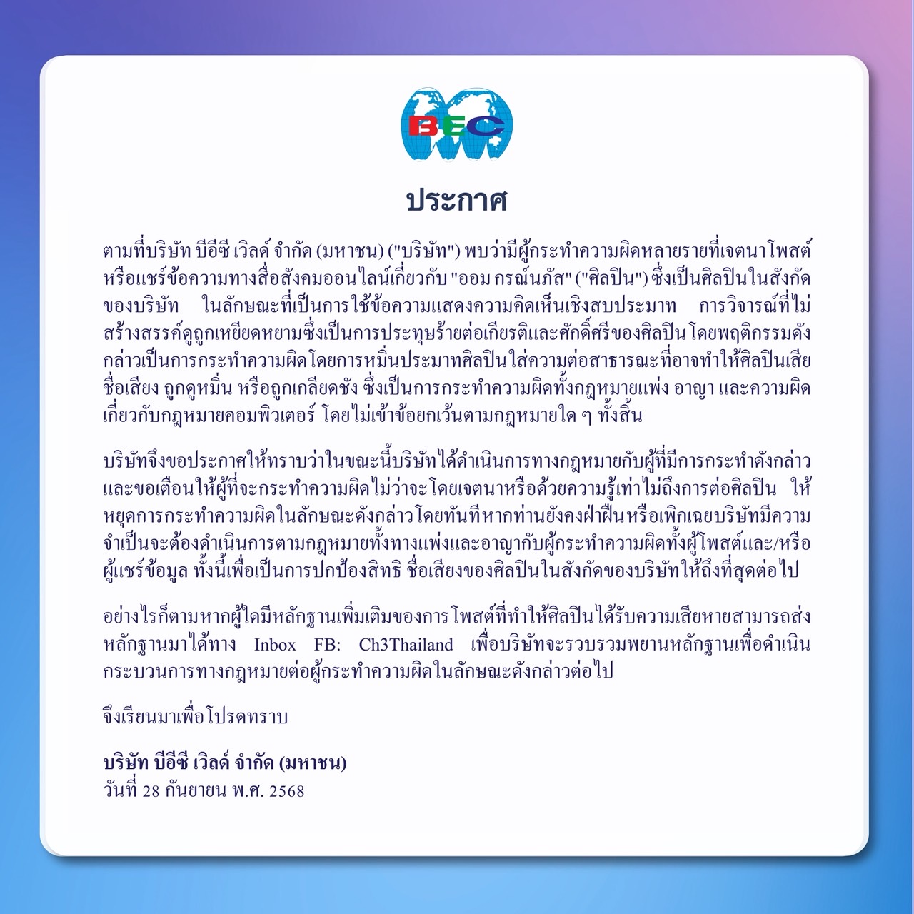 แถมรอบนี้ช่อง 3 ใช้คำว่า BEC ปกติที่ผ่านมาช่องจะใช้คำว่าทีมกฏหมายช่อง 3 กับโลโก้ช่อง 3