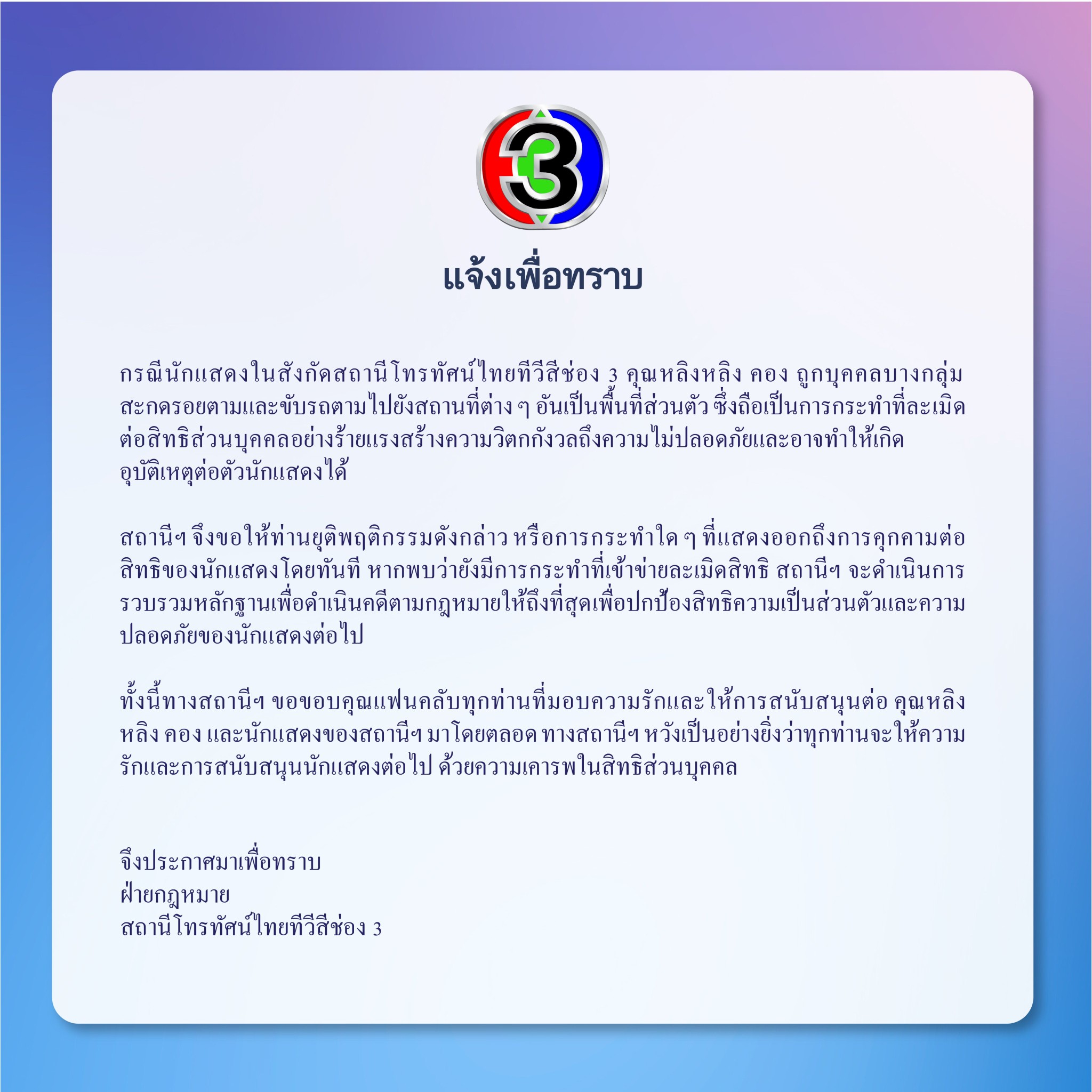ช่อง 3 เริ่มฟ้องคนที่พิมพ์ข้อความเสียหายใส่น้องออมแล้ว!!