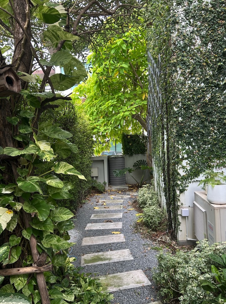 ทางเดินเน้นต้นไม้ที่ดูแลง่ายลงมาหลายต้นไม่ค่อยรอดเพราะโดนแดดแค่บางเดือน เลยลงเล็บครุท แดดก็ได้ร่มก็รอด ปัญหาตอนนี้คือ