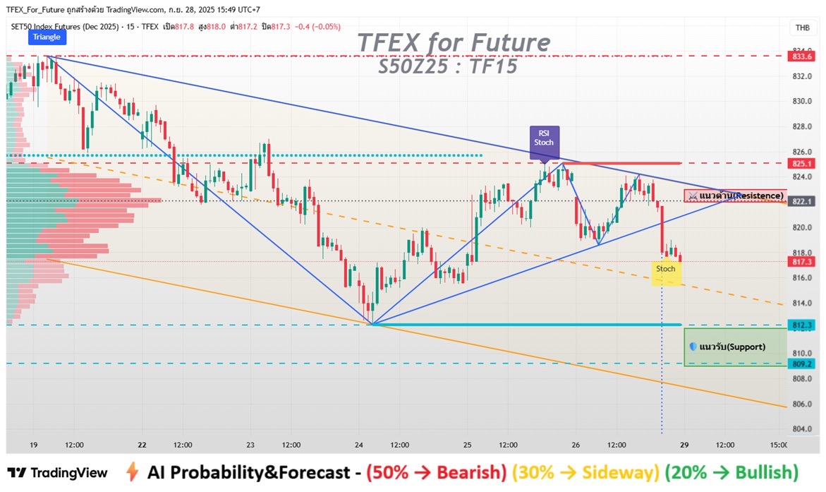 🔹 50% → Bearish ต่อเนื่อง หลุด 816 → ลุ้น 812–809