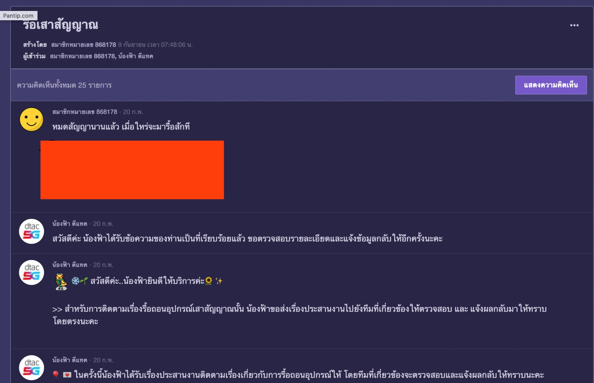 หลังไมค์ pantip ตั้งแต่เดือนกุมภาฯ ถามไปหลายรอบ ก็มีแต่คำตอบเดิมๆ และมีคอลเซนเตอร์โทรมาแค่ครั้งเดียว ให้คำตอบว่า จะประสานให้ เดี๋ยวตอบกับอีกที ติดต่อใครก็ไม่ได้ เบอร์ที่ให้มาก็ไม่มีใครรับ