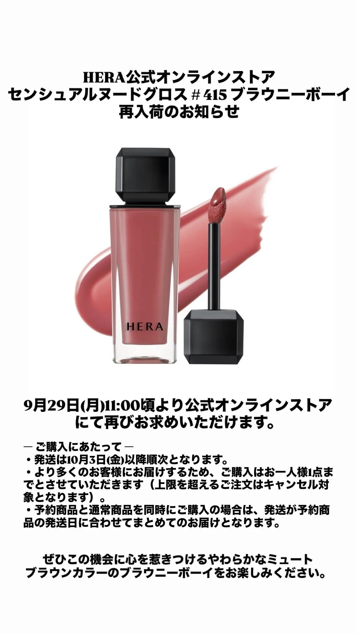 Sensual Nude Gloss #415 Brownie Boy ซึ่งนำกลับมาวางขายอีกครั้งในร้านค้าออนไลน์อย่างเป็นทางการของ Hera เมื่อวันนี้ ได้จำหน่ายหมดเนื่องจากความต้องการอย่างล้นหลาม