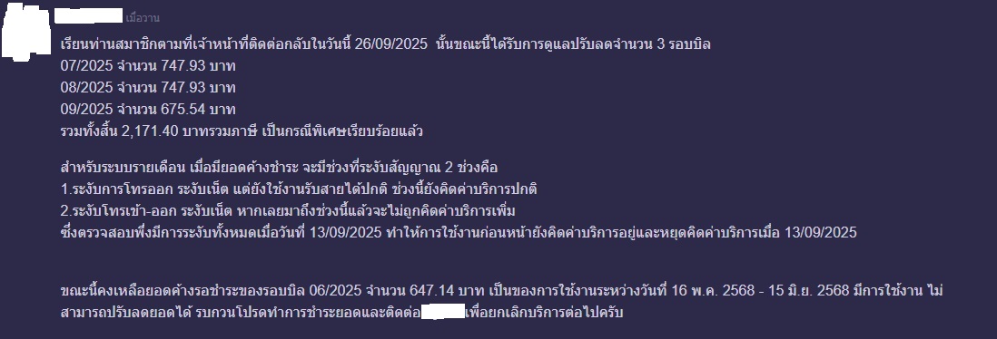 วันที่ 26 กันยายน 2568 พนักงานค่ายเขียวได้โทรมาแจ้งว่า เบอร์ที่ย้ายไม่สำเร็จเนื่องจากติดสิทธิพิเศษของทางค่ายเดิม ตอนนั้นผมค่อนข้างวุ่นจึงไม่ได้ซักถามต่อ และในช่วงเย็นคอลเซ็นเตอร์ค่ายแดงโทรมาแจ้งว่าคำขอลด 3 รอบบิลได้รับการอนุมัติ ลูกค้าสามารถชำระยอดค้าง 648 บาท พร้อมยกเลิกเบอร์ที่ช็อปค่ายแดงได้เลย ในรูปที่ (3) แต่ผมค่อนข้างวุ่นเรื่องงานจึงไม่ได้เข้าไป