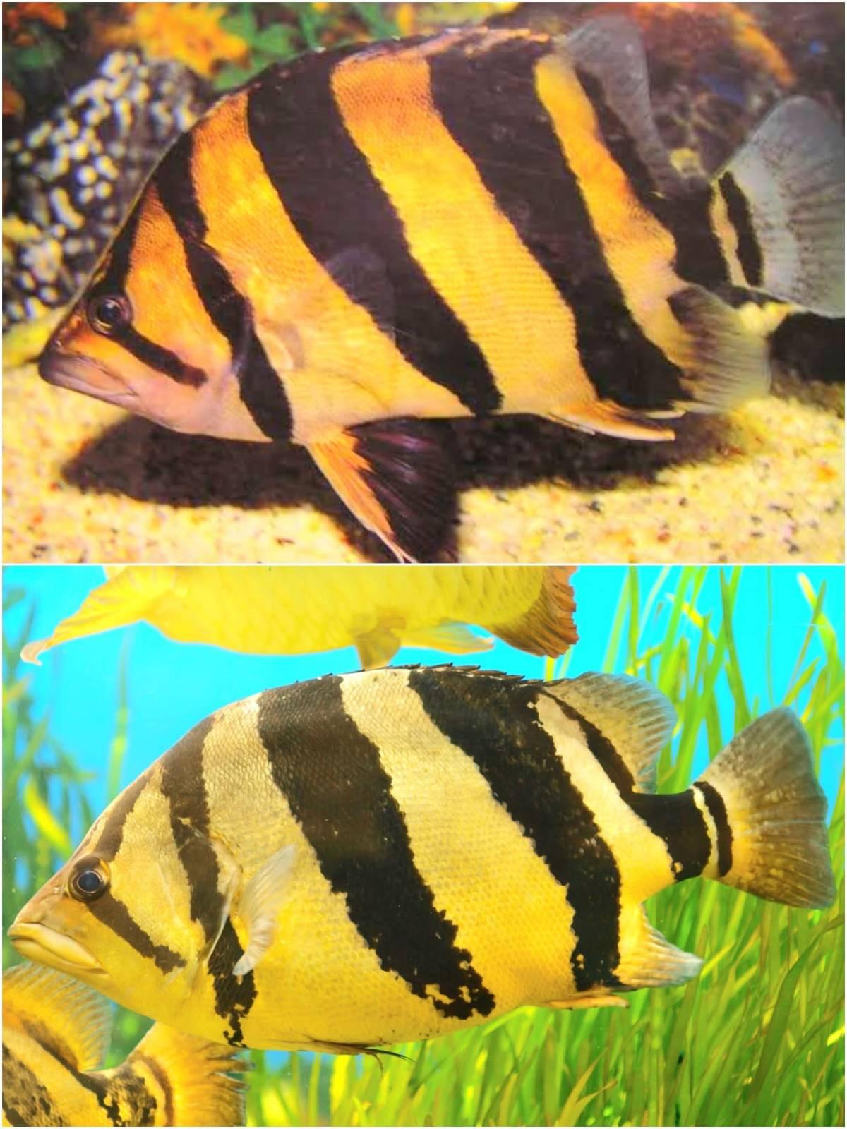 🐠พื้นลำตัวมีสีเหลืองสด หรือเหลืองอมส้ม ไปจนถึงสีน้ำตาล และมี แถบสีดำขนาดใหญ่ 5-6 แถบ พาดในแนวขวางลำตัว