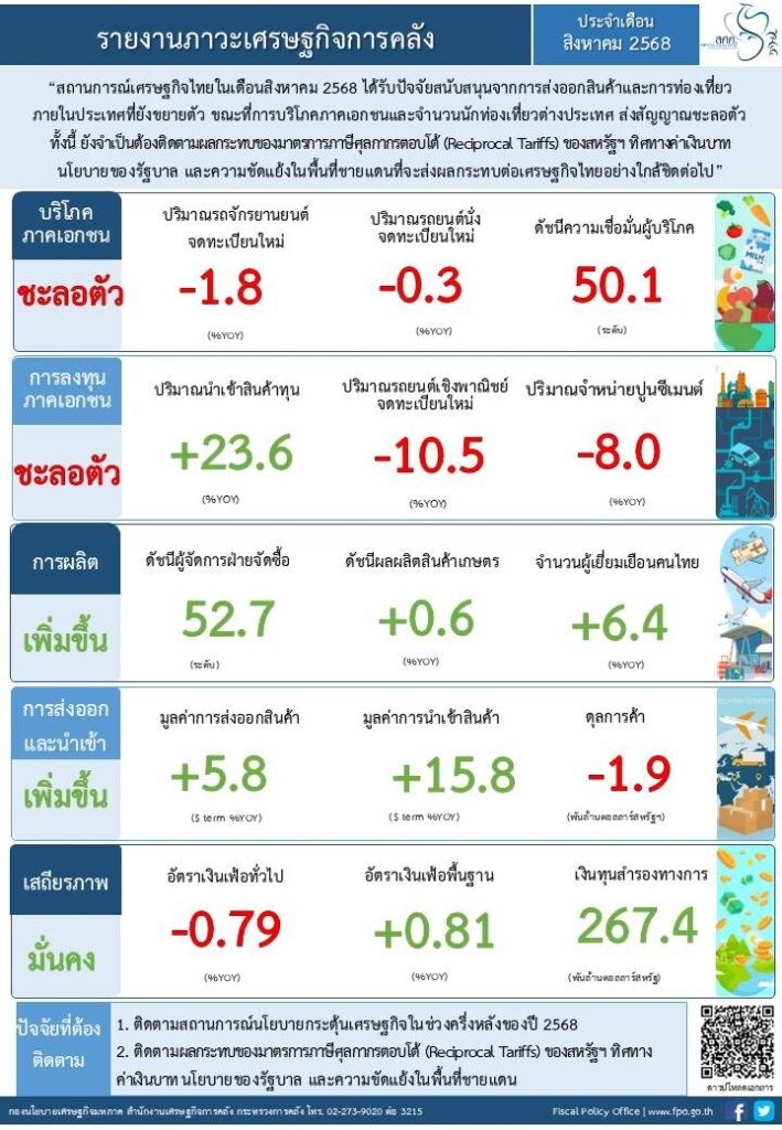 คลัง เผย เศรษฐกิจไทยเดือน ส.ค. 68 ได้แรงหนุนจากการส่งออก-ท่องเที่ยวในประเทศที่ยังขยายตัว แม้บริโภคเอกชน-นักท่องเที่ยวต่างชาติชะลอตัว พร้อมจับตาภาษีตอบโต้สหรัฐ-ความขัดแย้งชายแดน