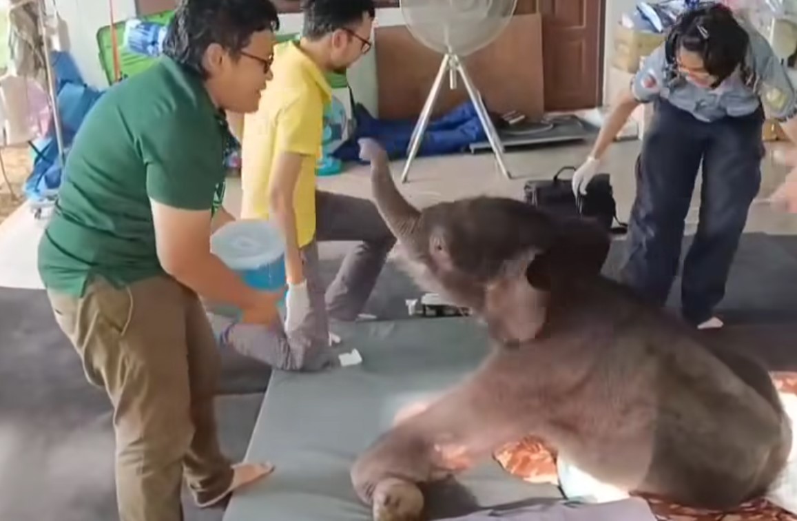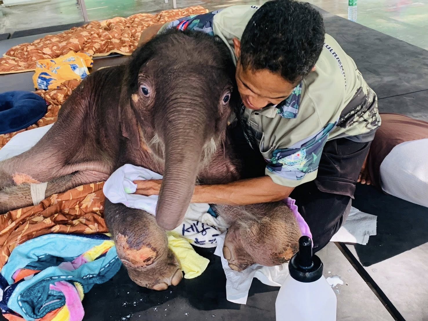 2. ลูกช้างป่ามีกำลังในการถีบตัวเองเพื่อให้ตัวเองยืนขึ้นบ่อยครั้งขึ้น โดยมีสัตวแพทย์และคณะเจ้าหน้าที่ช่วยพยุงตัว จับเท้ายืดเหยียด ขณะเดิน