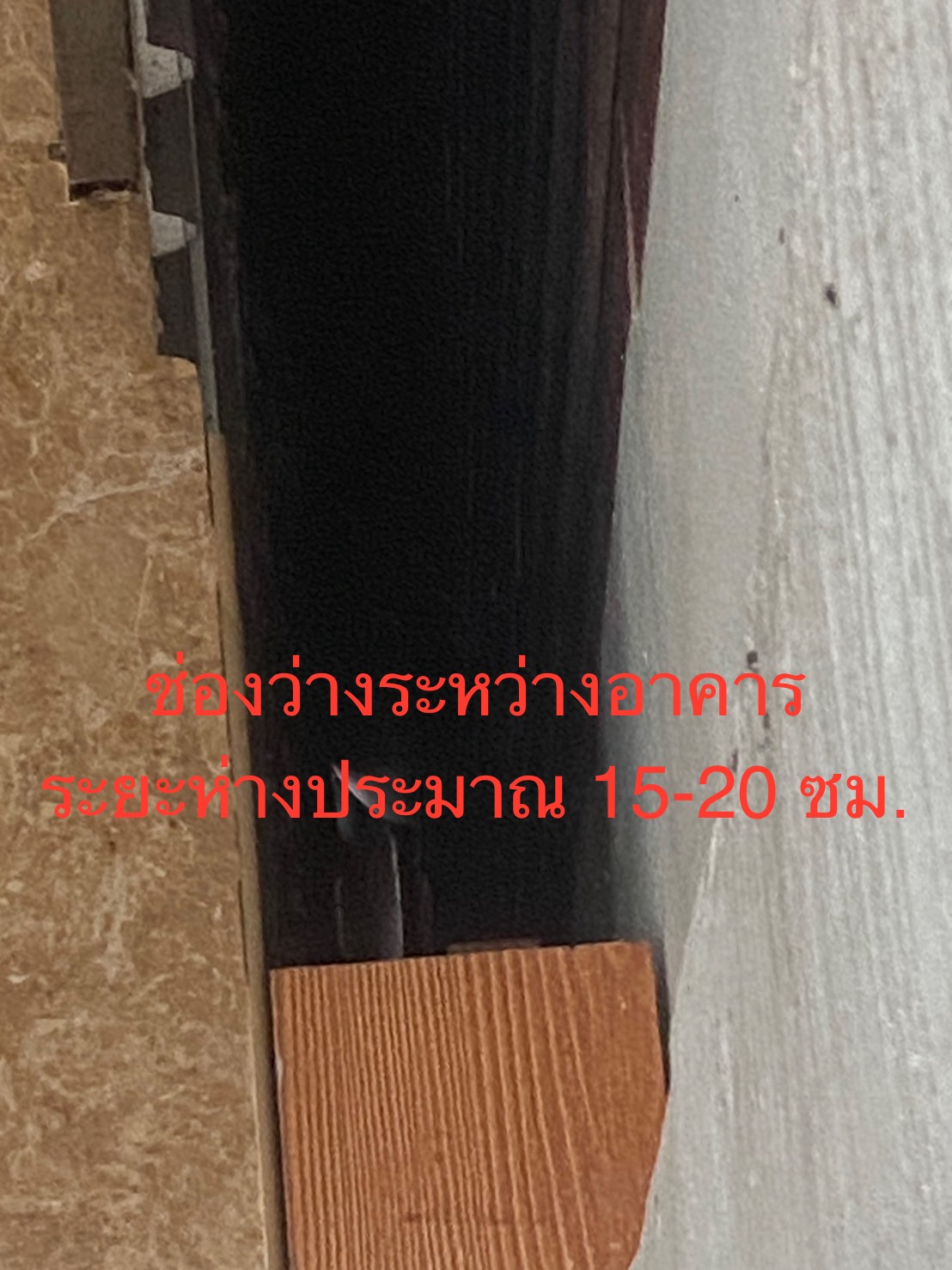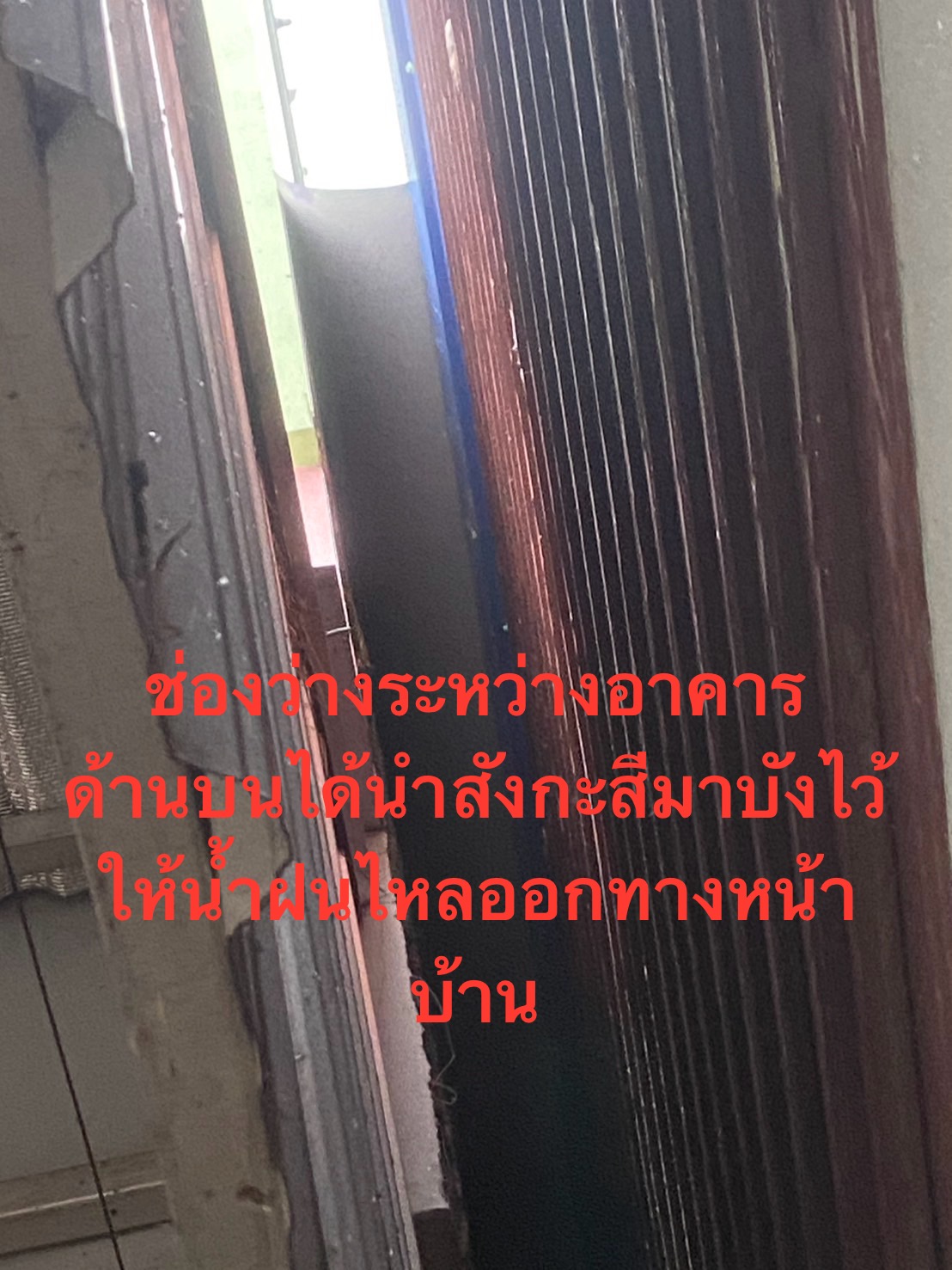 ที่ได้แก้ไขไปคือ 1.นำสังกะสีปิดไว้ที่ช่องว่างระหว่างตึกข้างบนให้น้ำไหลลงที่หน้าบ้าน(ไม่ให้ไหลลงที่ว่างระหว่างตึก)