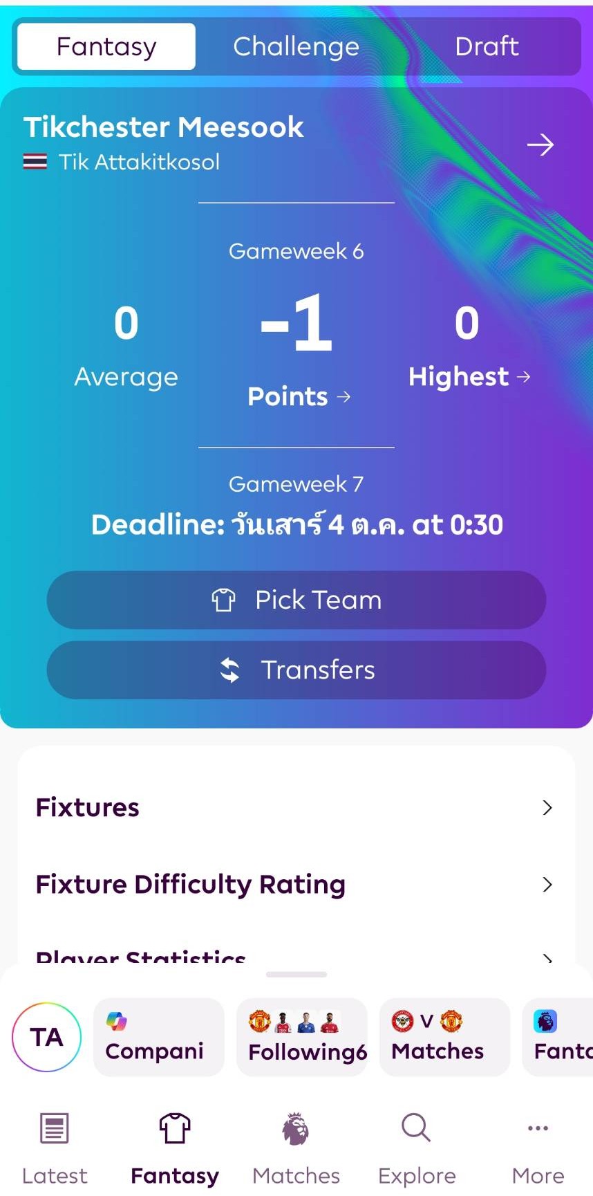 FPL (Fantasy Premier League) สรุปทีม Gameweek 6