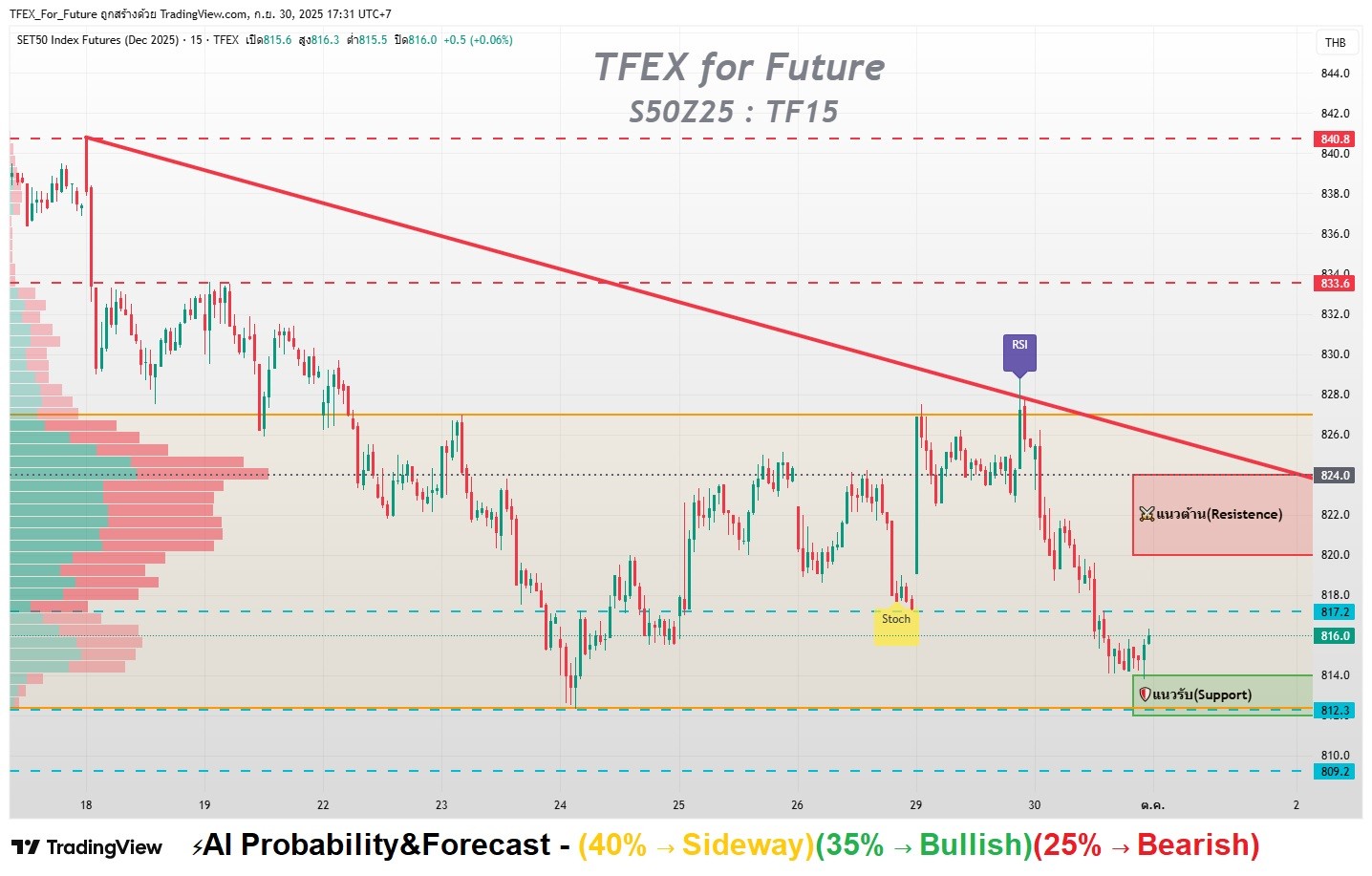 🔹 40% → Sideway 812–824 (แกว่งรอทิศทางชัด)