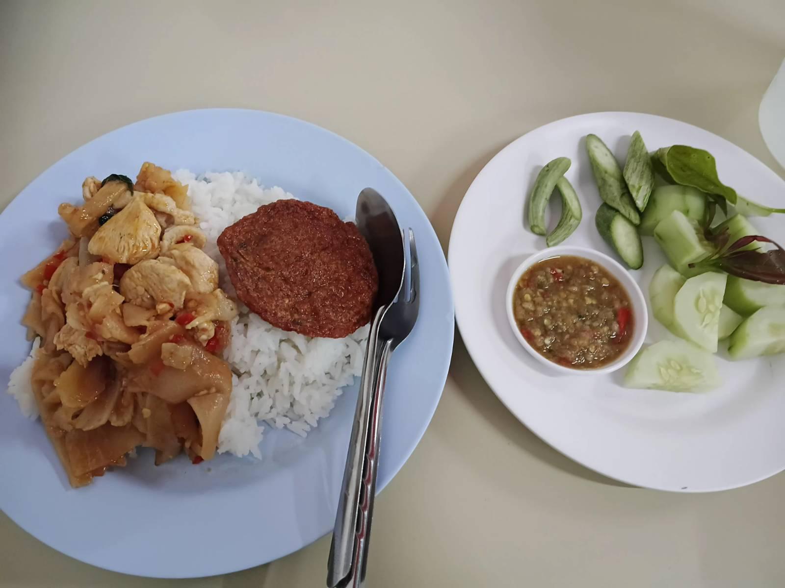 ผมสั่งเป็นแกงเขียวหวานเนื้อ กับ หมูทอดครับ และมีไส้กรอกราดซอส อีก ลูกชายทานข้าว กับปลาทูครับ มีผักและน้ำพริกให้ตักทานได้ครับ ผมซื้อขนม เอแคลร์ ตบท้าย แล้วซื้อปลาทู กับบ้านไว้ให้ลูก