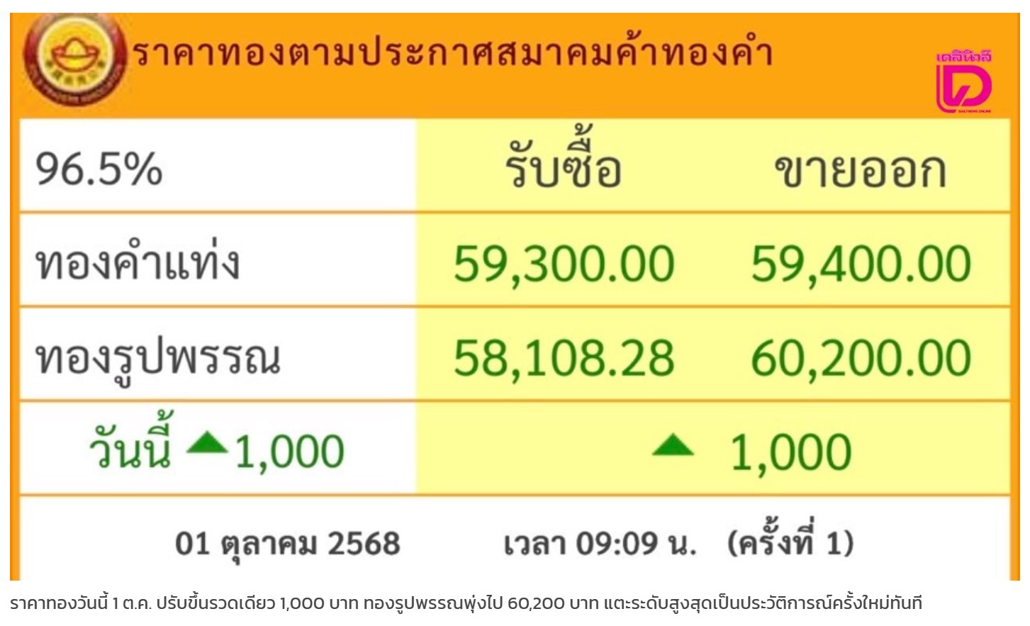 ราคาทองวันนี้ 1 ต.ค. ปรับขึ้นรวดเดียว 1,000 บาท ทองรูปพรรณพุ่งไป 60,200 บาท แตะระดับสูงสุดเป็นประวัติการณ์ครั้งใหม่ทันที