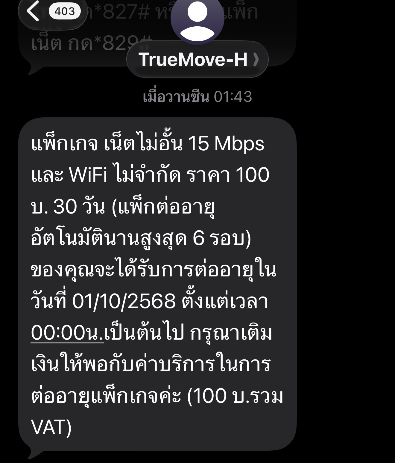 แพ็กเกจ เน็ตไม่อั้น 15 Mbps และ WiFi ไม่จำกัด ราคา 100 บ. 30 วัน (แพ็กต่ออายุอัตโนมัตินานสูงสุด 6 รอบ) ของคุณจะได้รับการต่ออายุในวันที่ 01/10/2568 ตั้งแต่เวลา 00:00น.เป็นต้นไป กรุณาเติมเงินให้พอกับค่าบริการในการต่ออายุแพ็กเกจค่ะ (100 บ.รวม VAT)