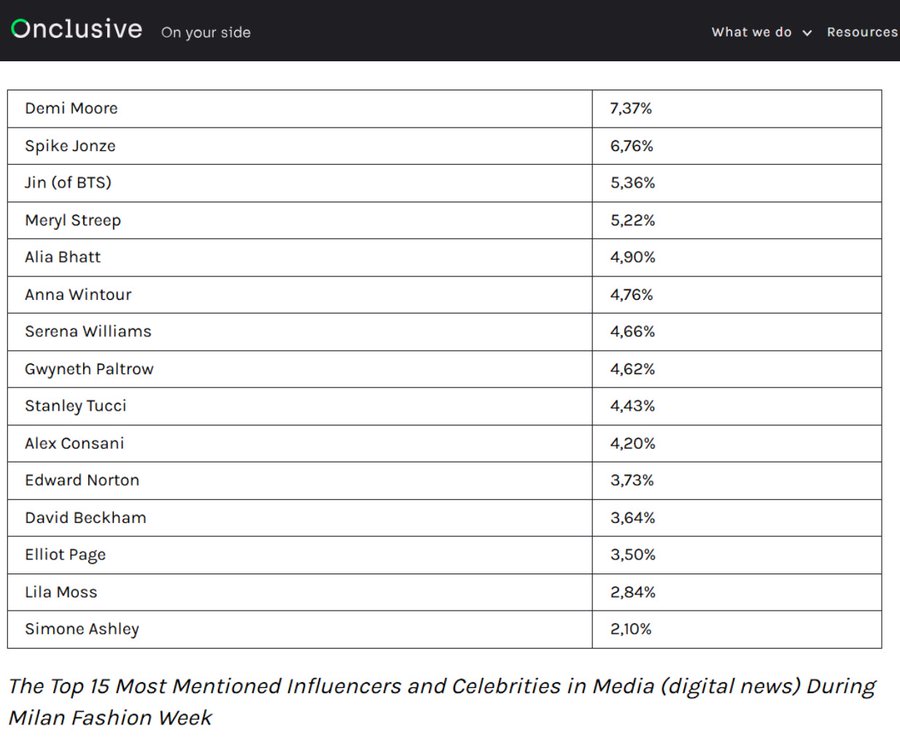 รายชื่อของ อินฟลูเอนเซอร์และคนดังที่ถูกกล่าวถึงมากที่สุด ในงาน MFW