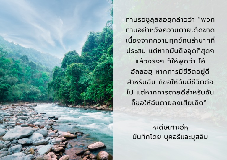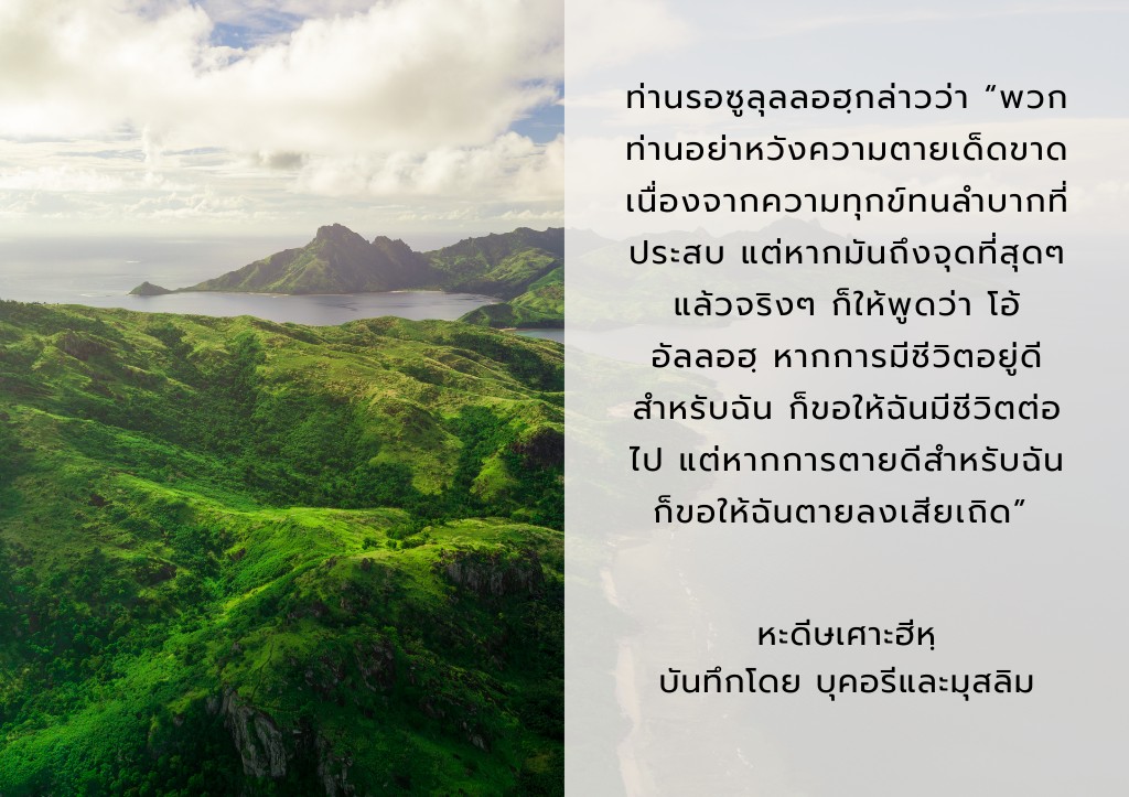 – ท่านรอซูลุลลอฮฺกล่าวว่า “พวกท่านอย่าหวังความตายเด็ดขาด เนื่องจากความทุกข์ทนลำบากที่ประสบ แต่หากมันถึงจุดที่สุดๆ แล้วจริงๆ ก็ให้พูดว่า โอ้ อัลลอฮฺ หากการมีชีวิตอยู่ดีสำหรับฉัน ก็ขอให้ฉันมีชีวิตต่อไป แต่หากการตายดีสำหรับฉัน ก็ขอให้ฉันตายลงเสียเถิด” (หะดีษเศาะฮีหฺ บันทึกโดย บุคอรีและมุสลิม)