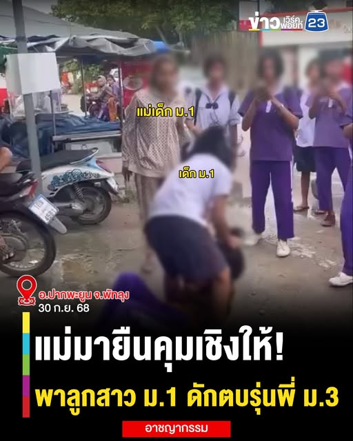 แม่เด็ก ม.3 ร้อง เจอนักเรียน ม.1 พาแม่มาดักตบลูกสาวที่หน้าโรงเรียน โดยแม่ของผู้ก่อเหตุคอยยืนคุมเชิงไม่ให้คนอื่นช่วย แถมท้าทายให้แจ้งความ บอกรู้จักกับตำรวจ ทำอะไรไม่ได้หรอก