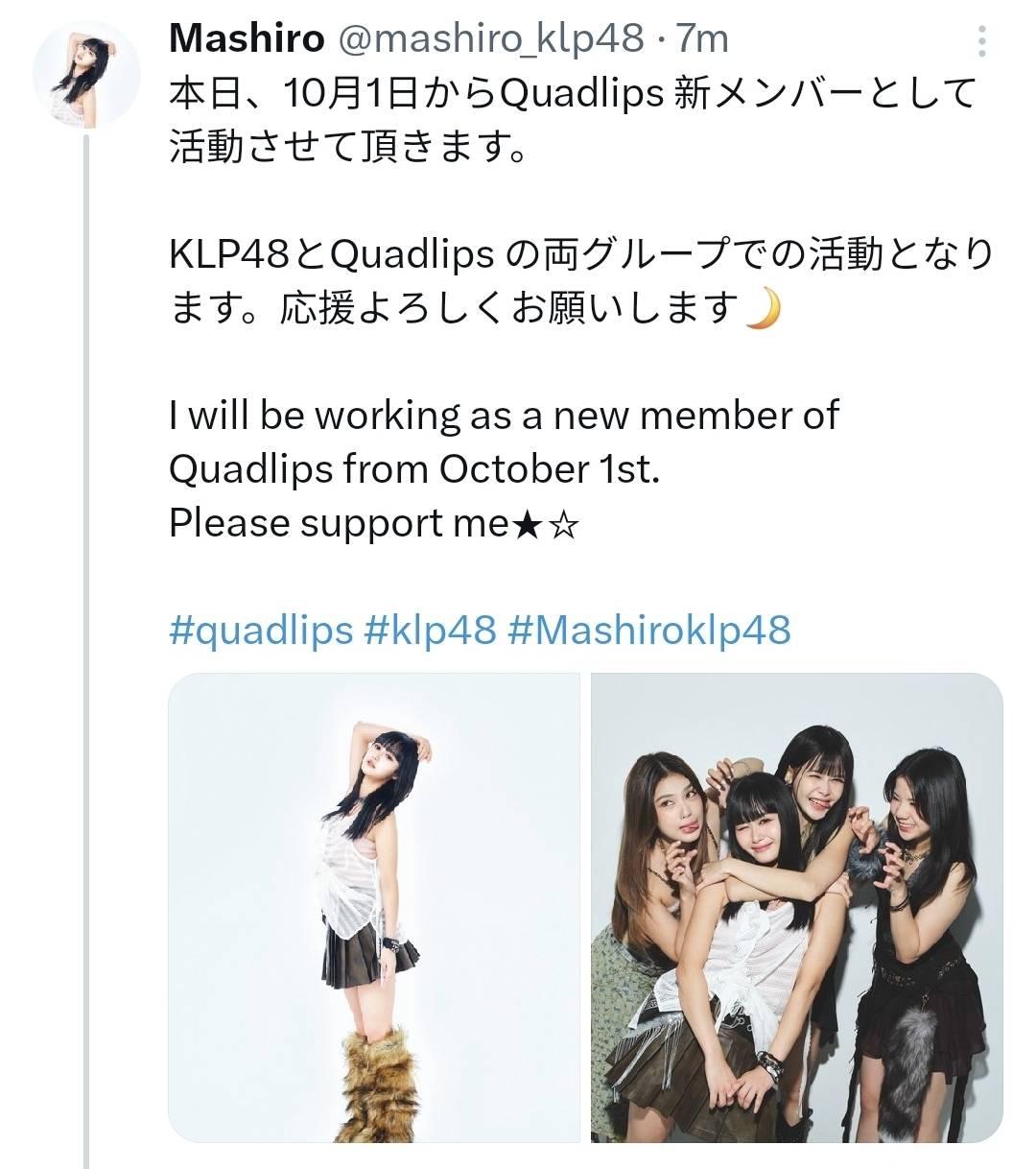 โดยมาชิโระ จะทำหน้าที่ในวง Quadlips ร่วมกับสามสมาชิกเดิม ทั้ง "เฟนี (Feni)" จากวง JKT48 ของอินโดนีเซีย "เฟม (Fame)" จากวง BNK48 ของไทย และ "โคล (Cole)" จากวง MNL48 ของฟิลิปปินส์
