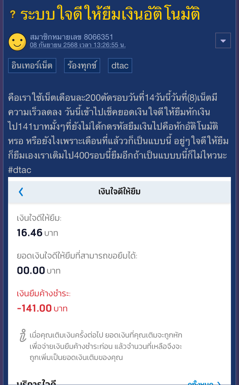ใจดีให้ยืม ของ DTAC ยืมเงินเองอัตโนมัติ เอาไปต่อเน็ตเอง ทั้งๆ ที่ไม่ได้มีการแจ้งให้ยินยอมเลยค่ะ