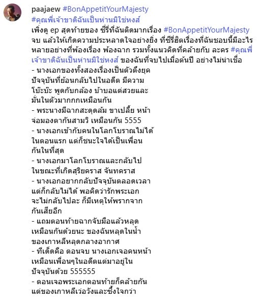 ป้าแจ๋ว ยุทธนา ได้โพสต์ข้อความไล่เรียงจุดที่คล้ายกันระหว่างละครไทยและซีรีส์เกาหลีเรื่องนี้ไว้อย่างละเอียด ว่า “เพิ่งดู ep สุดท้ายของ ซีรีส์ที่ฉันติดมากเรื่อง #BonAppetitYourMajesty จบ แล้วให้เกิดความประหลาดใจอย่างยิ่ง ที่ซีรีส์ฮิตเรื่องที่ฉันชอบนี้มีอะไรหลายอย่างที่พ้องเรื่อง พ้องฉาก รวมทั้งแนวคิดที่คล้ายกับ ละคร #คุณพี่เจ้าขาดิฉันเป็นห่านมิใช่หงส์ ของฉันที่จบไปเมื่อต้นปี อย่างไม่น่าเชื่อ – นางเอกของทั้งสองเรื่องเป็นตัวตึงยุค