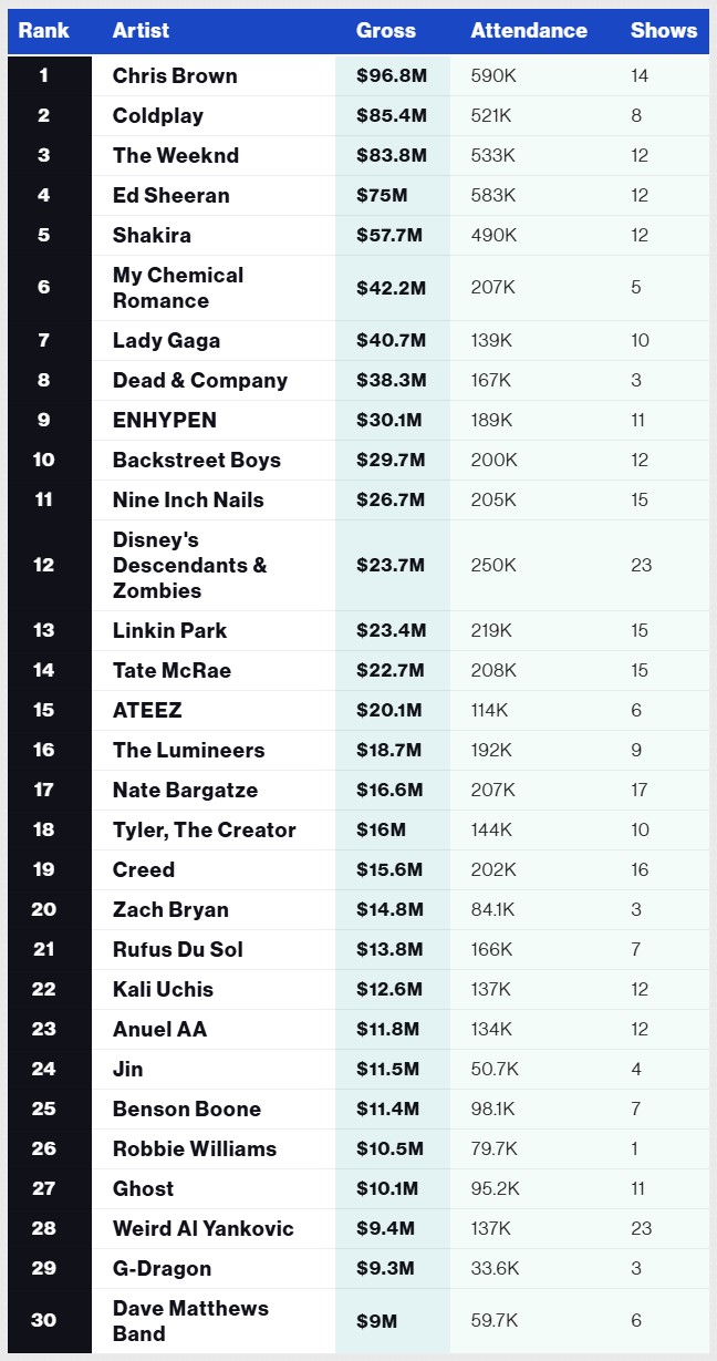 อันดับทัวร์คอนเสิร์ต Billboard (ประจำเดือนสิงหาคม 2025)