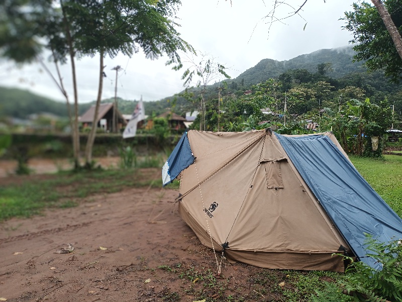 ฝนยังปรอยๆ เบาๆ รีบปูผ้าใบและกาง Bushcraft โดยด่วน ปูพลาสติกรองพื้นเต็นท์ คลุมหลังคา ปิดด้านหน้า แล้วทะยอยขนของ กางเต็นท์ จัดบ้าน รวมประมาณ 2 ชม.ก็เสร็จ