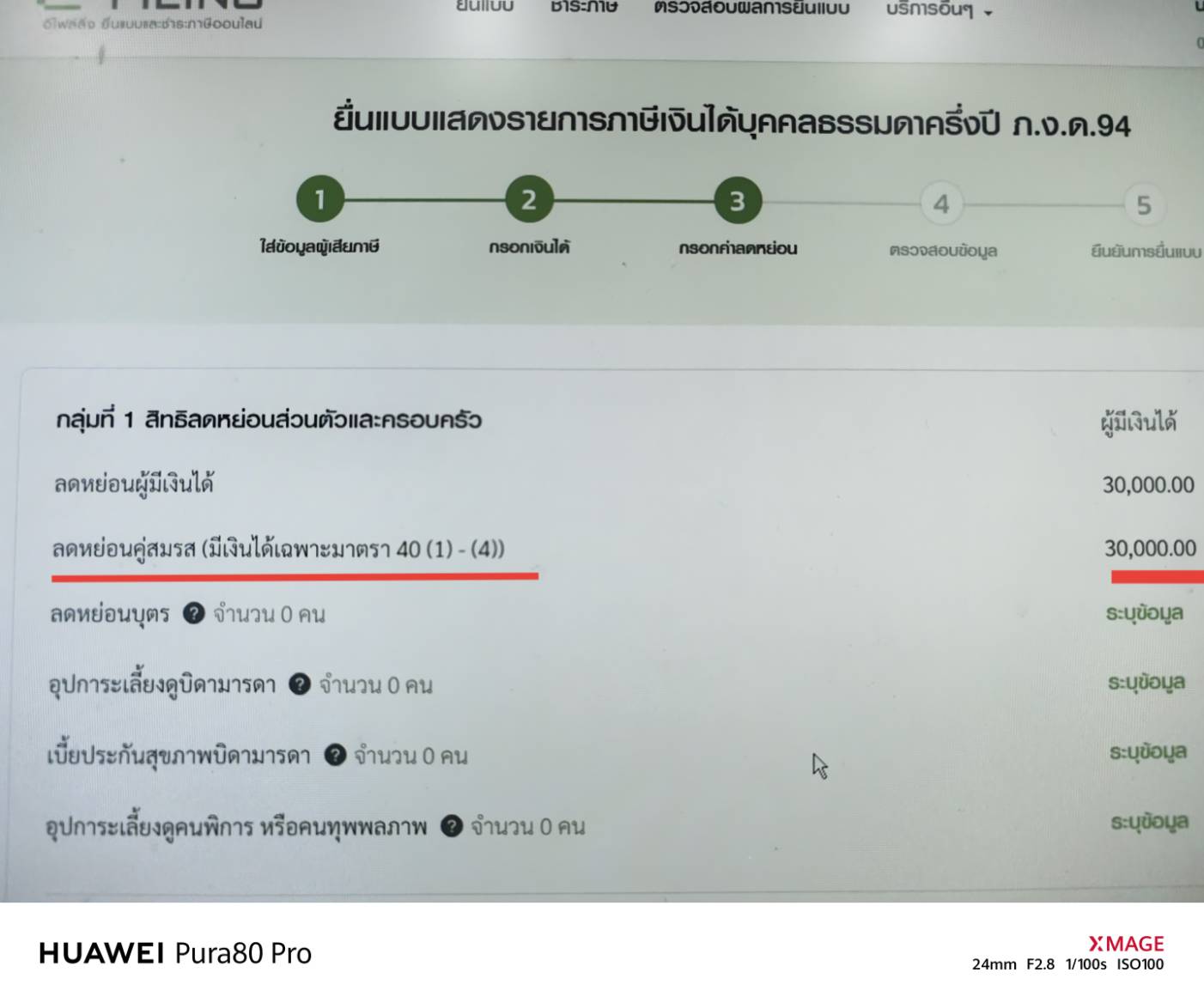แต่ถ้าเราเลือก คู่สมรสมีเงินได้เฉพาะมาตรา40(1)-(4) เราจะได้หักลดหย่อนอีก30000 บาท