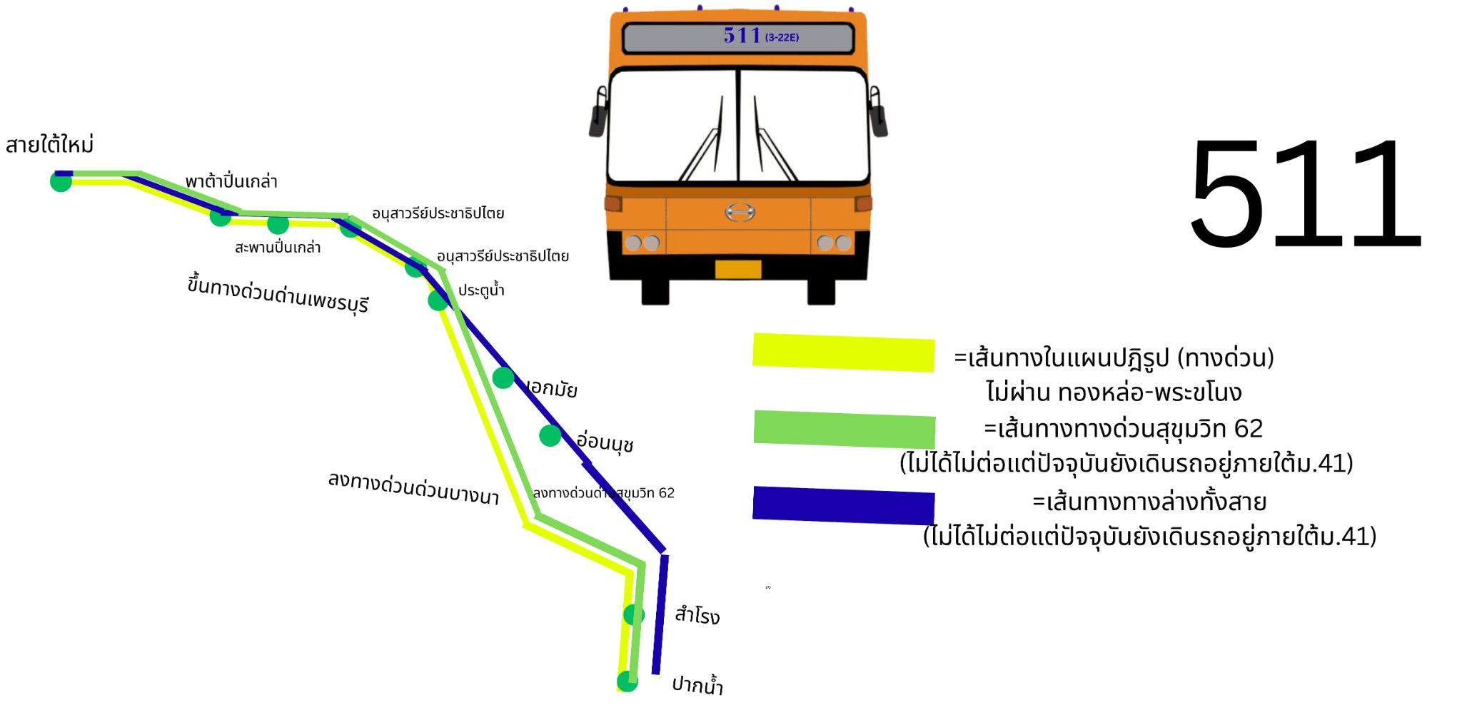 สำหรับเส้นทางปฏิรูป รถเมล์สาย 511 จะให้บริการในเลขสาย 511 (3-22E) โดยจะเหลือเพียงรถทางด่วน และปรับให้ขึ้นทางด่วนด่านบางนา
