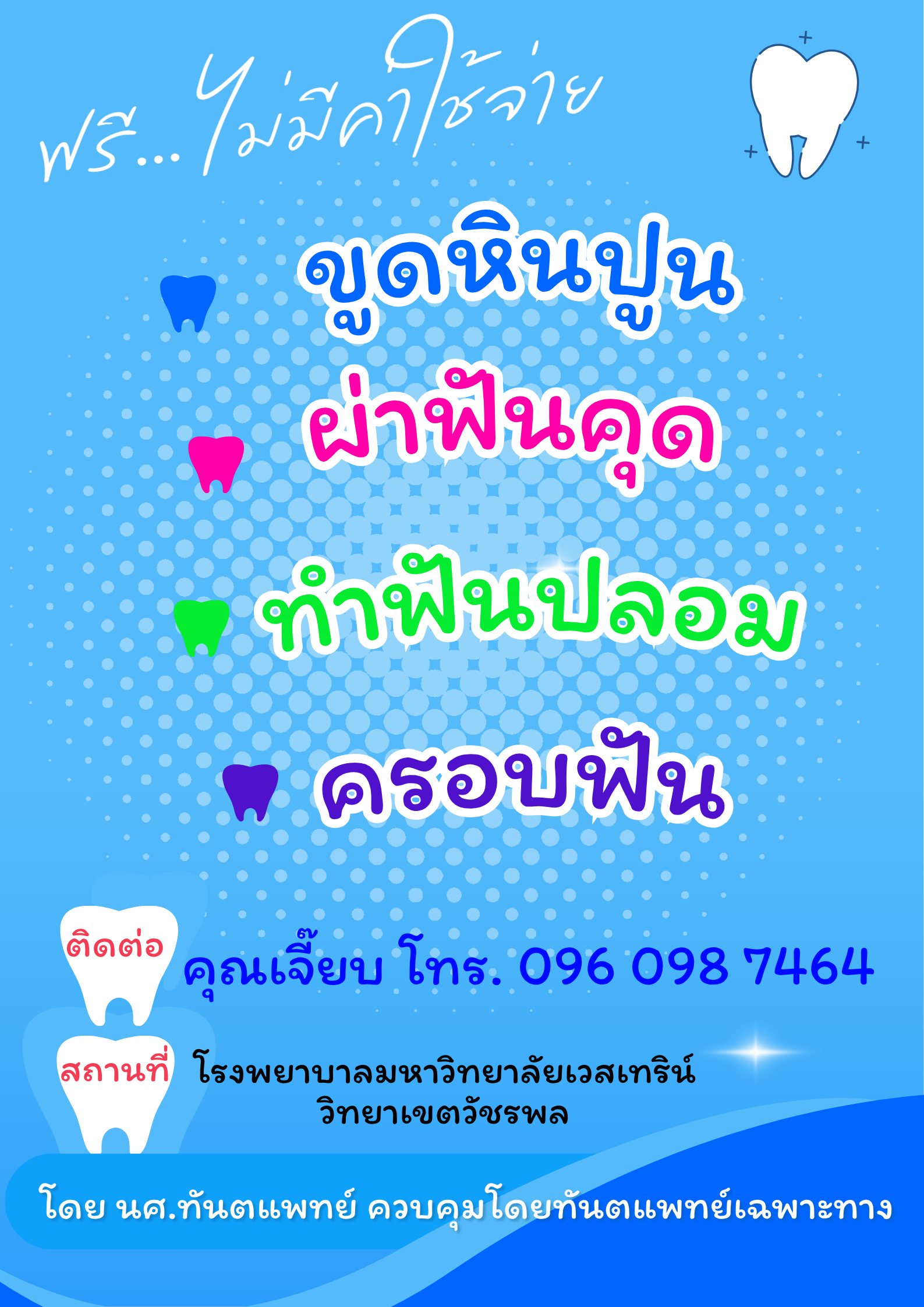 +++ รับคนไข้ที่ต้องการขูดหินปูน อุด-ถอน ฟัน ฟรี!!! +++ สถานที่: โรงพยาบาลทันตกรรม มหาวิทยาลัยเวสเทิร์น วิทยาเขตวัชรพล เวลา: ในวันเวลาราชการ จันทร์-ศุกร์ เวลา 8.30 -16.00 น. เบอร์ติดต่อ :
