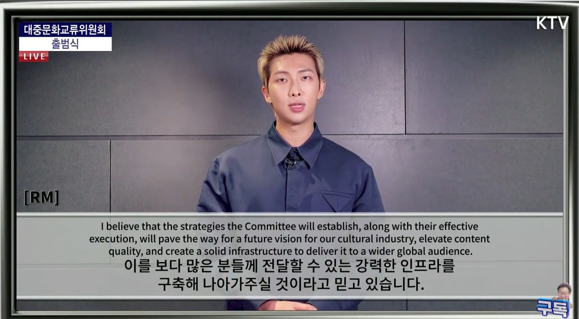 "สวัสดีครับ ผม RM แห่งวง BTS ขอแสดงความยินดีอย่างสุดซึ้งกับการจัดตั้งคณะกรรมการเฉพาะกิจของประธานาธิบดีว่าด้วยการแลกเปลี่ยนวัฒนธรรมยอดนิยม ถือเป็นเกียรติอย่างยิ่งที่ได้มีส่วนร่วมในข้อความนี้ ซึ่งเป็นก้าวแรกที่สำคัญ เนื่องจากคณะกรรมการมองว่าอุตสาหกรรมวัฒนธรรมเป็นกลไกสำคัญในการเติบโตในอนาคตของเกาหลี