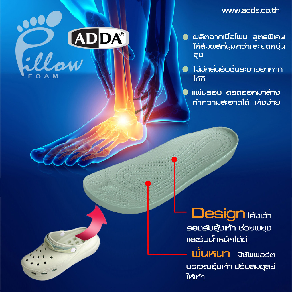 เหมาะกับใส่ทำงานในออฟฟิศ ใส่เดินเที่ยววันสบาย ๆ หรือใส่อยู่บ้านก็นุ่มสุภาพ เลือกสีและไซส์ได้ตามสไตล์ที่ชอบ ช่วยอัปเกรดความสบายในทุกก้าวของวันด้วย รองเท้าแตะ ADDA Pillow Foam ผู้หญิง 🌤️