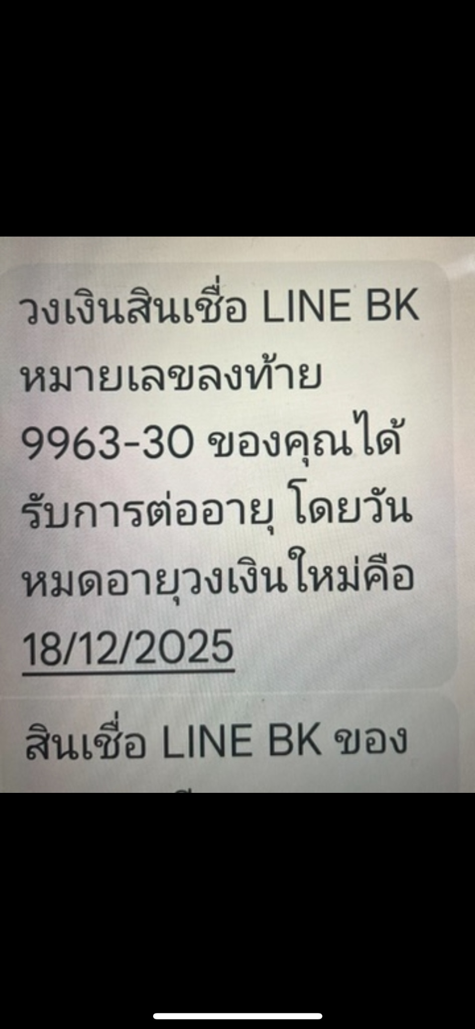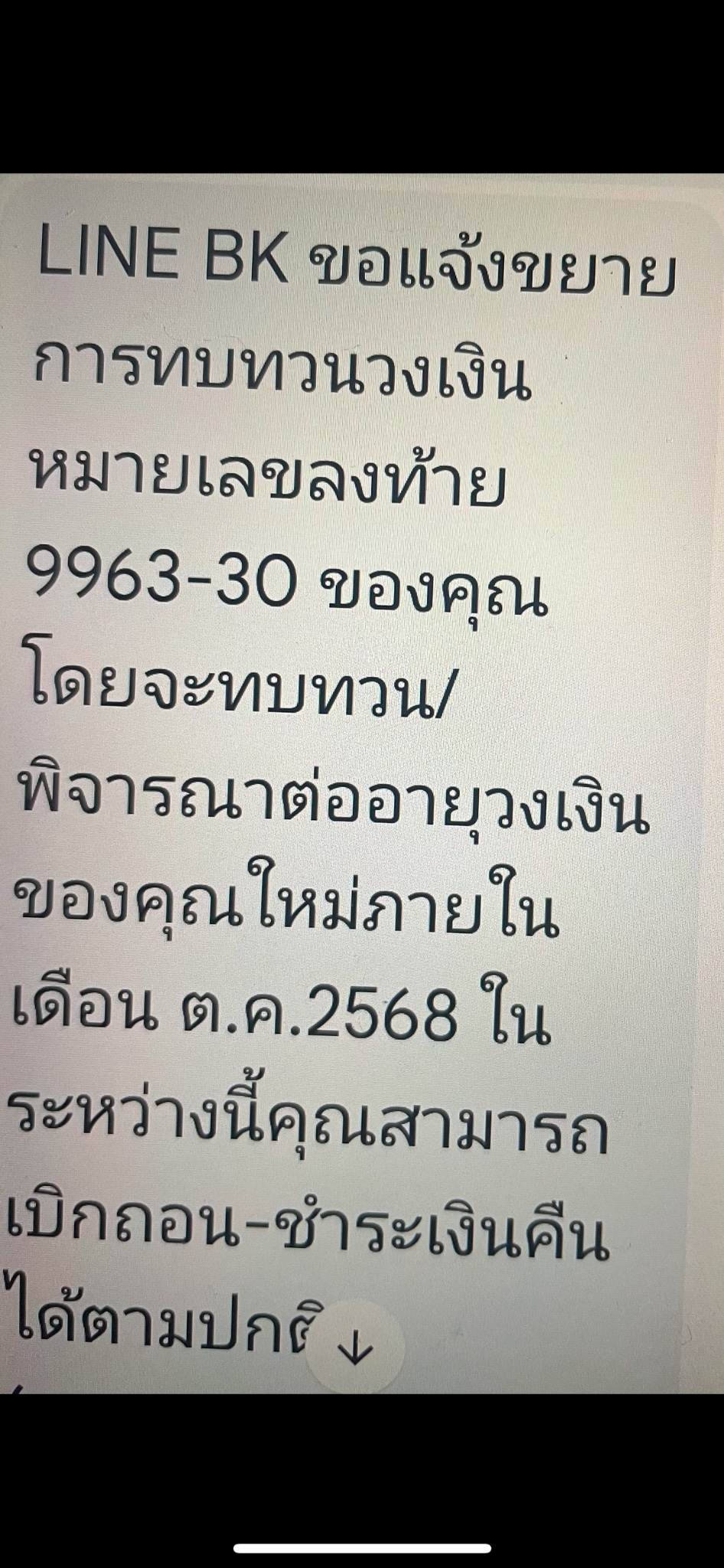 LINE BK ขอแจ้งขยายการทบทวนวงเงินหมายเลขลงท้าย 30 ของคุณ โดยจะทบทวน/พิจารณาต่ออายุวงเงินของคุณใหม่ภายในเดือน ม.ค.2567 ในระหว่างนี้คุณสามารถเบิกถอน-ชำระคืนได้ตามปกติ&n