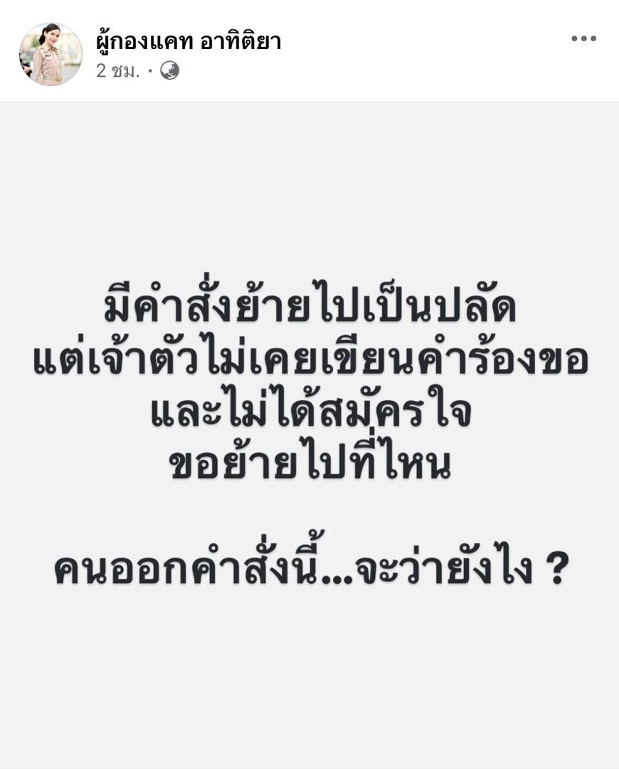 ก่อนหน้านี้เมื่อเวลา 15.30 น.ที่ผ่านมา เจ้าตัวโพสต์ข้อความผ่านทางเฟซบุ๊กระบุว่า “มีคำสั่งย้ายไปเป็นปลัด แต่เจ้าตัวไม่เคยเห็นคำร้องขอและไม่ได้สมัครใจขอย้ายไปที่ไหน คนออกคำสั่งนี้…จะว่ายังไง?”