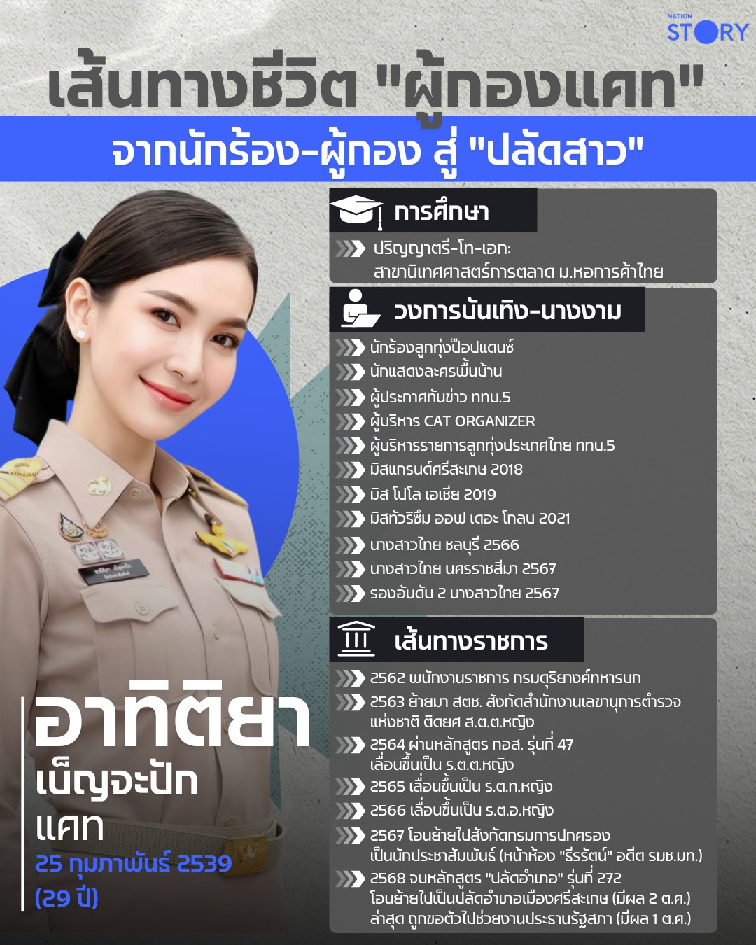 วันที่ 1 ตุลาคม 2568 ผู้สื่อข่าวรายงานว่าจากกรณีกระแสวิพากษ์วิจารณ์เส้นทางการเติบโตทางราชการของ ร.ต.อ.หญิงอาทิติยา เบ็ญจะปัก หรือ ผู้กองแคท นักประชาสัมพันธ์ปฏิบัติการ กรมการปกครอง โดยเมื่อไม่นานมานี้มีชื่อได้รับการแต่งตั้งเป็นปลัดอำเภอเมืองศรีสะเกษ จากนั้นมีการขอตัวไปช่วยราชการที่สำนักงานเลขาธิการสภาผู้แทนราษฎร แต่ปรากฏว่ากรมการปกครองไม่อนุมัติ
