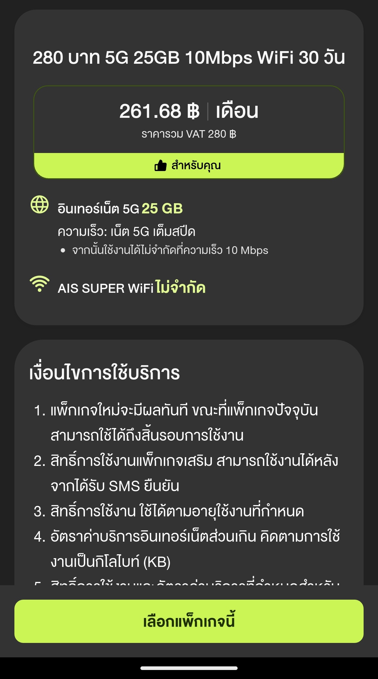 มีโปรนี้มั้ยครับ เหมา เหมา เดือนละ 280บ.(รวม VAT) เน็ต 5G 25GB พร้อมเน็ต เร็ว 10Mbps และ AIS SUPER WiFi ไม่จํากัด หักค่าบริการทุก เดือน นาน 6 เดือน (กรณีมียอดเงินไม่เพียงพอในวันตัดค่าแพ็ก จะสามารถชำระ