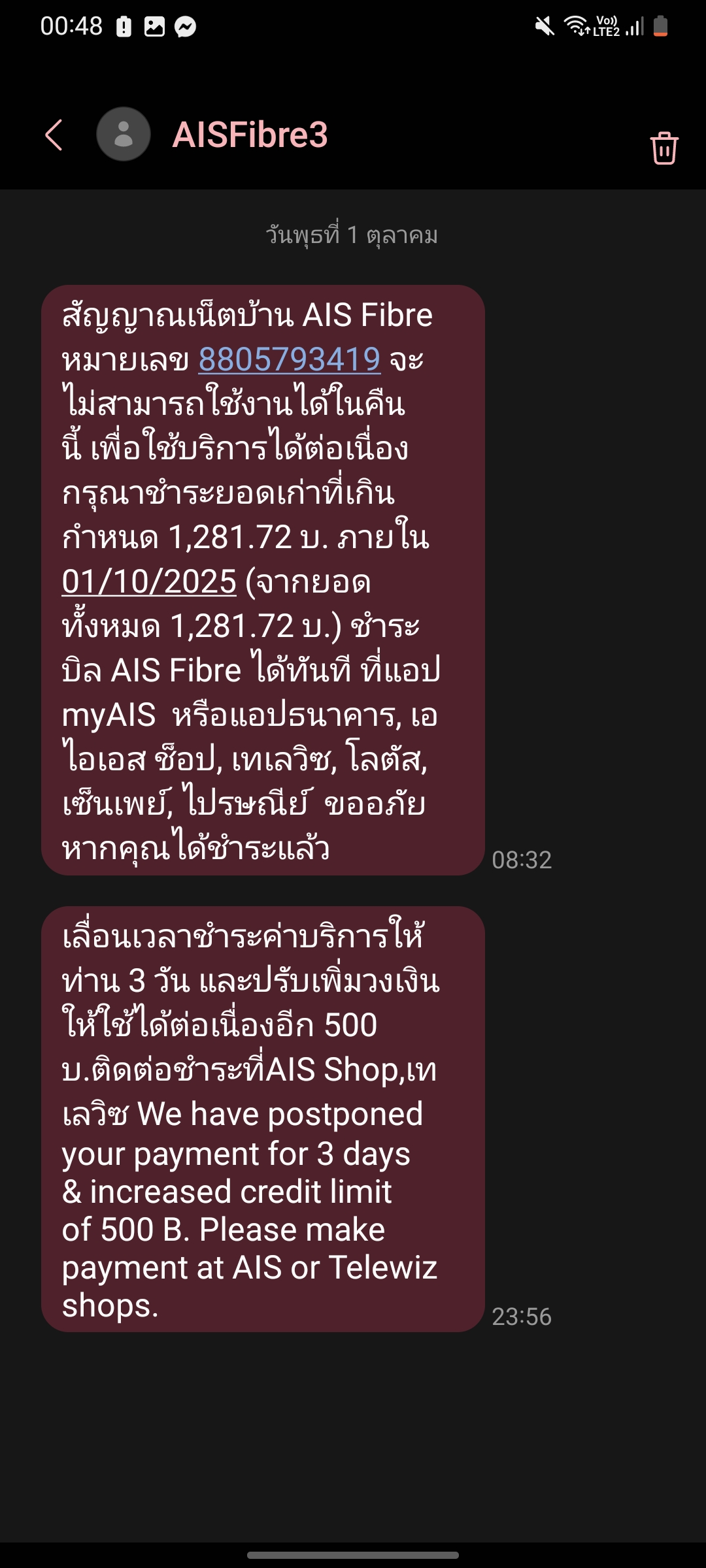 รบกวนเปิดสัญญาณชั่วคราว ให้หน่อยชำระมีความจำเป็นต้องใช้อินเตอร์เน็ตเพื่อขายสินค้าออนไลน์ค่ะ สามารถชำระ 1 รอบบิลวันที่ 5 ตุลาคม 68 และอีก 1 รอบบิล วันที่ 20 ตุลาคม 68 ค่ะ