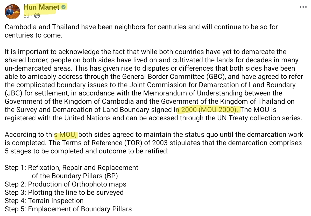 -มีคนอ้างว่าวุ้นเส้นอยากยกเลิก MoU ทั้งที่ วุ้นมาเนตพึ่งโพสต์ไปเองว่าอยากให้ไทยกลับไปปักปันเขตแดนตามข้อตกลงที่ได้ทำร่วมกันไว้ใน MoU