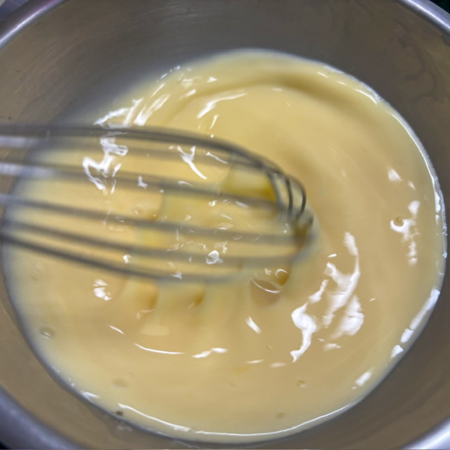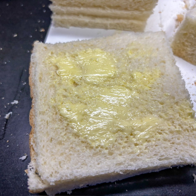 ตอกไข่ไก่ลงไป สักสองฟอง ก็เพียงพอตีให้เข้ากัน เตรียมขนมปัง และด้านในขนมปังก็ทาเนยสักหน่อย เพื่อให้ขนมปังติดกันไม่หลุด