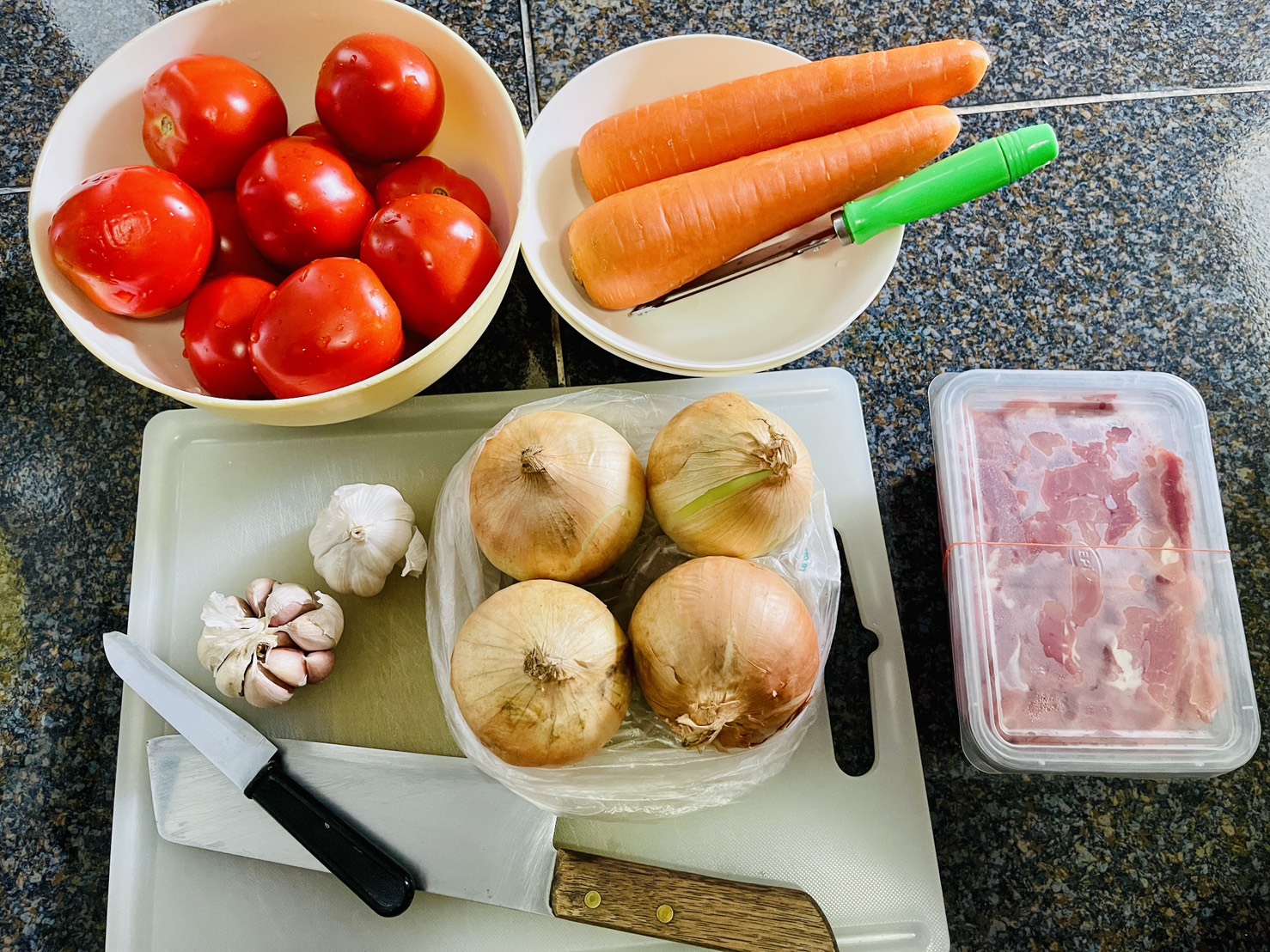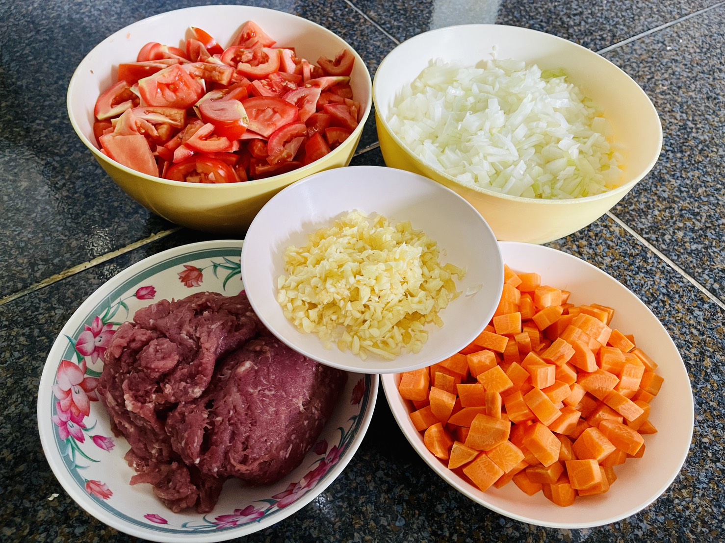 เอาเนื้อแดงมาสับละเอียดก่อน ซอยหอมใหญ่ กระเทียม และแครอทหั่นเต๋า ครั้งนี้ไม่ใส่ Tomato Paste อยากจะใช้วิธีเคี่ยวให้นานๆหน่อย