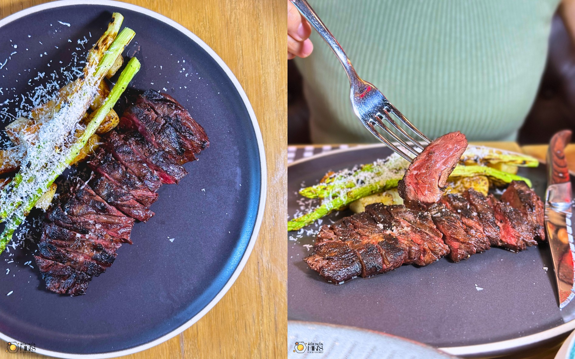 Entrama (1250++) สเต็กเนื้อแฮงเกอร์วากิวออสเตรเลีย Grain-fed 380 วัน เนื้อฉ่ำ นุ่มแต่แน่น ย่างในเตา Josper ให้กลิ่นควันเบาๆ เสิร์ฟคู่กับมันฝรั่งอบชีสพาเมซานและหน่อไม้ฝรั่งย่างเพิ่มความสดกรอบ เป็นจานที่แสดงความพรีเมียมของเนื้อออกมาเต็มๆ
