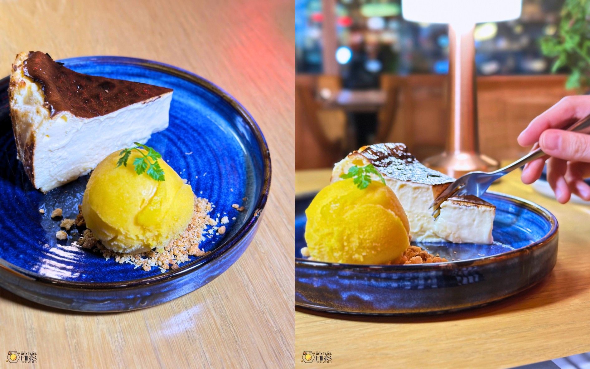 Pura Brasa Basque Burnt Cheesecake (320++) ชีสเค้กบาสก์ เนื้อครีมมี่ เสิร์ฟกับไอติมเสาวรสเปรี้ยวสดชื่น ตัดกับรสเข้มของชีสได้ลงตัว เป็นการปิดท้ายมื้อที่หอมละมุนและสดใส
