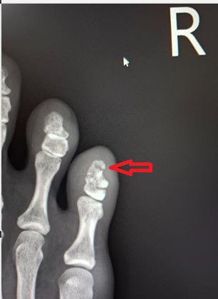 วันที่ 1 กย. 68 นิ้วบวมแดงไม่หายเลยไปหาหมอ X-ray พบว่ากระดูกปลายนิ้วแตกตามรูป หมอให้ทำ Buddy taping
