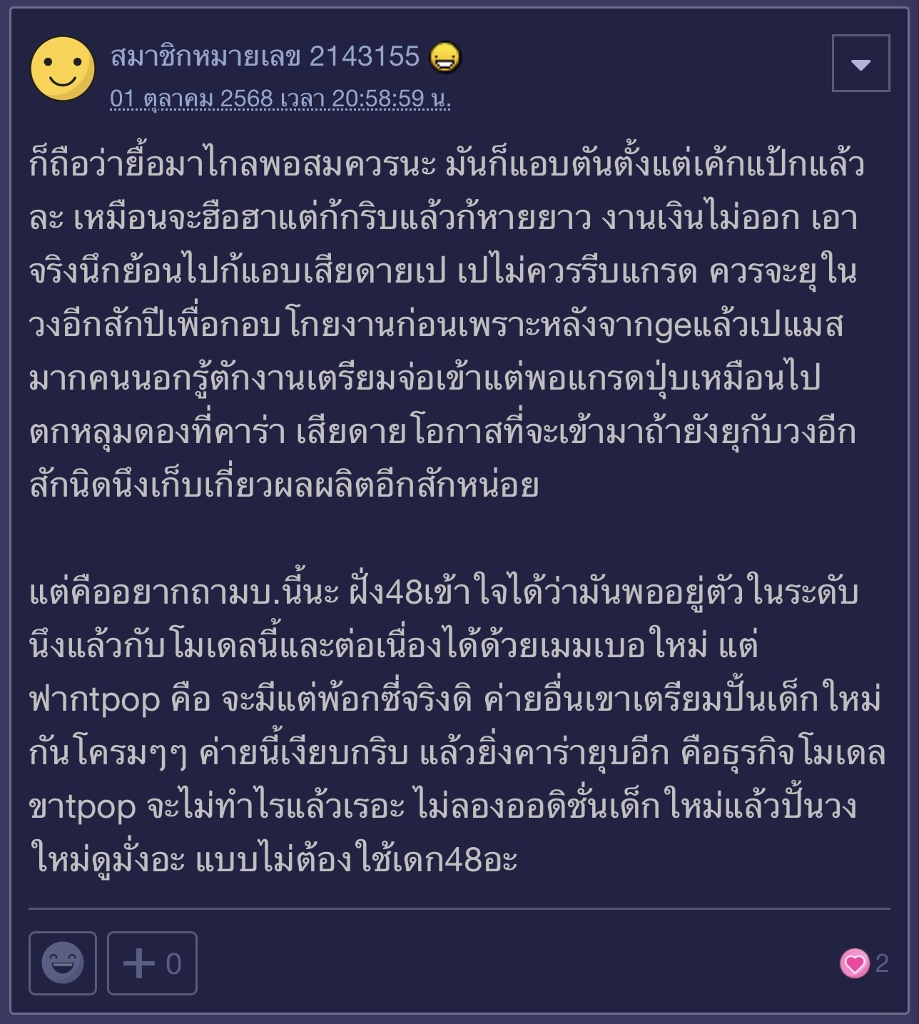 ส่วนเรื่องที่มีคนเสียดายน้อง คือมีคนคิดเหมือนนี่ แต่ตอนนั้นน้องก็เลือกเองอะ ถ้าให้พูดในมุมแฟนคลับวง ที่น้องเกิดมาจาก 48 ทุกคนก็คงคิดเหมือนกันอะว่ารีบแกรดทำไม แล้วตอนนั้นไม่รู้อฟช.ไปพูดอะไร หรือทำไมปล่อยน้องง่ายขนาดนั้น หรืออฟช.มั่นใจในการทำวง Girlgroup ขนาดนั้นเลยเหรอ เจ็บมา3ดอกเลยนะ วงไม่ได้มีกระแสเปรี้ยงปร้างอะไรเลย ตั้งแต่ LYRA จนถึง QRRA ถ้าเป็นนี่ นี่ไม่ออกจาก BNK แน่นอน แล้วอฟช.ไทย ไม่เหมือนรุ่นพี่ด้วยนะ ก็ไม่รู้ว่าทำได้มั้ย แต่ต่อให้ทำได้จริง มันก็ดูไม่ขลัง ไม่ศักดิ์สิทธิ์แล้วอะ กับการจะให้เมมที่แกรดไปแล้วสักคน กลับมาใหม่ เรื่องนี้นี่เป็นบทเรียนให้อฟช.สุด ๆ เลยนะ ว่าถ้ามันไม่รอด อย่าฝืนจริง ๆ