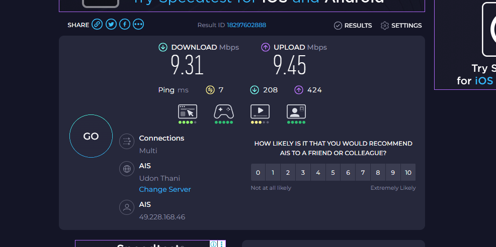 สอบถามครับ พอดีพึ่งย้ายบ้านมาใหม่ ได้ติดตั้งเน็ตของ ais เป็นตัว 1000/500 เป็น2เราเตอร์ ตัวหลักอยู่อีกห้อง ส่วนห้องผมใช่ตัวลูก ผมต่อสายlanจากเราเตอร์ตัวลูกเข้าคอม ความเร็วเหลือ 600/500 อันนี้รับได้ แต่