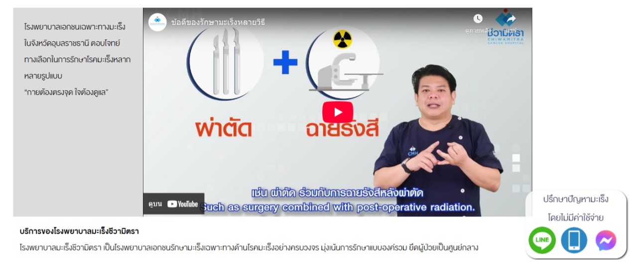 มาเล่าต่อหลังจากเพื่อนสนิทเจอก้อนในปอด ตอนนั้น หมอแนะนำให้รีบเข้ารับการรักษาเพราะปัจจุบันคิวรักษามะเร็งกับรพ.ใหญ่คือนานมาก (นานจริงๆ เพราะเพื่อนเราเริ่มกระบวนการตั้งแต่รู้ว่าเป็นก็ยังไปไม่ถึงไหนเลย หลายสิ่งมาก) เราก็ไม่อยากให้เพื่อนรอนานขนาดนั้น เลยเริ่มหาข้อมูล ทั้งเว็บสาธารณสุข พันทิป ช่องคุณหมอชื่อดังต่างๆ และเรื่องเล่าจากคนไข้จริง แล้วก็มาเจอโพสของคุณหมอจากโรงพยาบาลมะเร็งชีวามิตราในต๊อกๆ เป็นคลิปที่คุณหมอมาให้ความรู้ด้านมะเร็ง ซึ่งคุณหมอเน้นมากๆเลยนะเรื่องระยะเวลาการรอคอยที่ไม่ควรทิ้งเวลาไว้นาน รักษาทันที เพิ่มโอกาสและประสิทธิภาพในการรักษามะเร็งได้ และเครื่องมือในการรักษาที่ทันสมัยและตรงจุด อีกอย่างหนึ่งนะบรรยากาศใน รพ.ดูดีมากๆเลยอ่ะ เราเลยส่งคลิปให้เพื่อนดูเยอะมาก สรุปจบที่ขอนัดวิดีโอคอลคุยกับคุณหมอดูก่อน เพราะ รพ.อยู่ จ.อุบลฯ